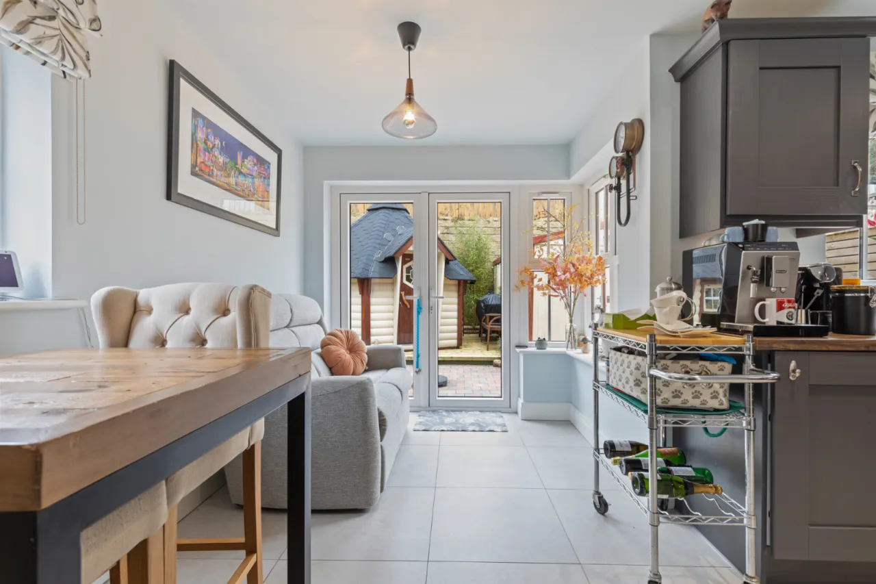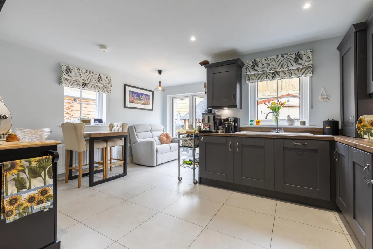 White enamel single drainer sink unit with mixer taps, dark grey shaker style units, wood effect Formica roll edge work surfaces, 4 ring gas hob unit, built in oven, stainless steel splashback and extractor hood, integrated fridge freezer, dishwasher and washing machine, larder cupboard, concealed lighting, concealed gas boiler, ceramic tiled floor, LED recessed spotlighting, uPVC double glazed French doors to rear landscaped garden.