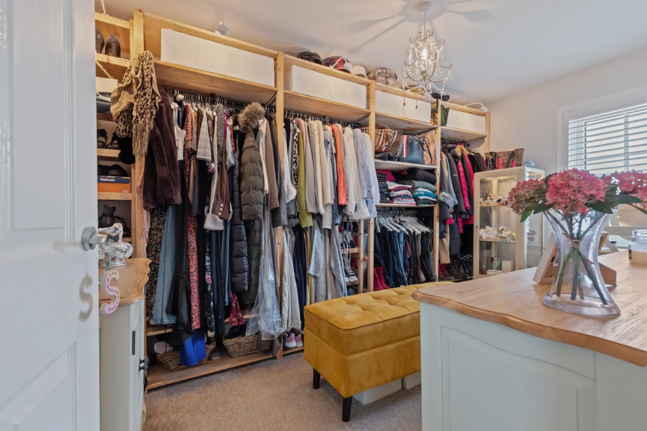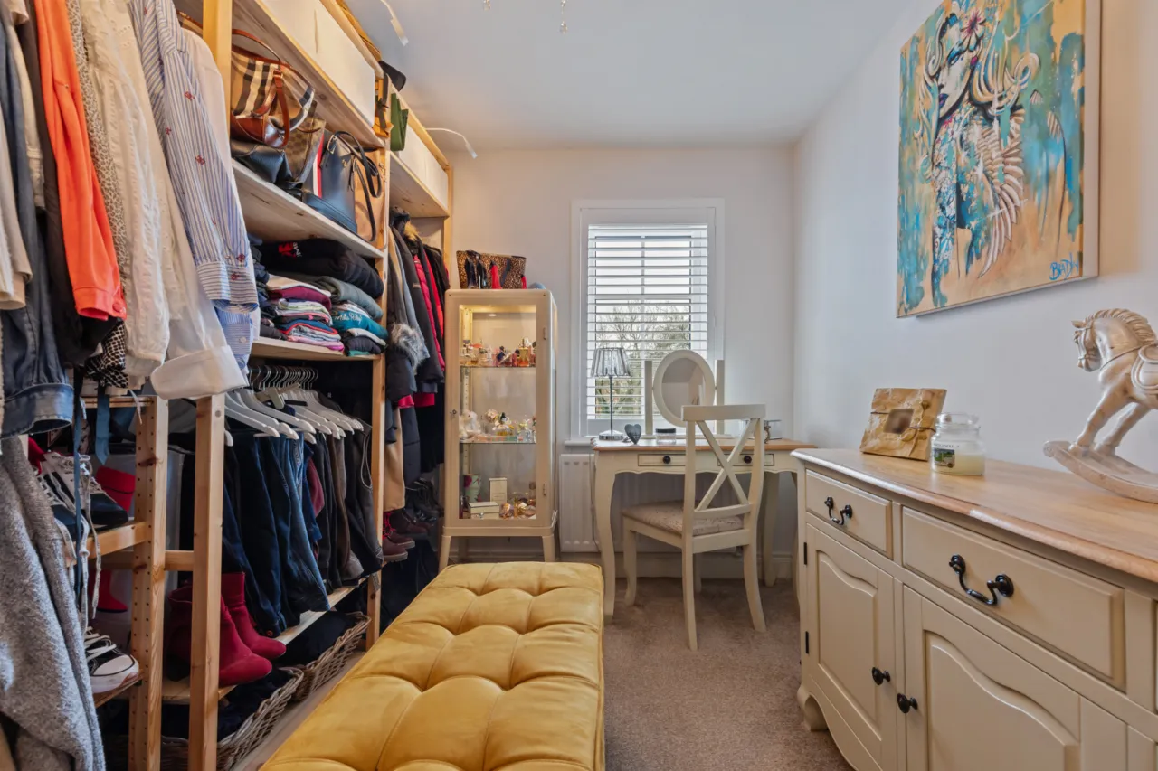 Concealed linen cupboard, access to partially floored roofspace via integrated ladder.