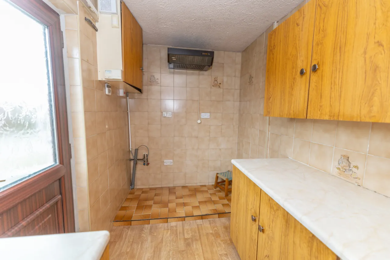 Range of upper and lower units with tiled splashback, stainless steel sink with drainer, laminate worktops, and plumbed for washing machine.