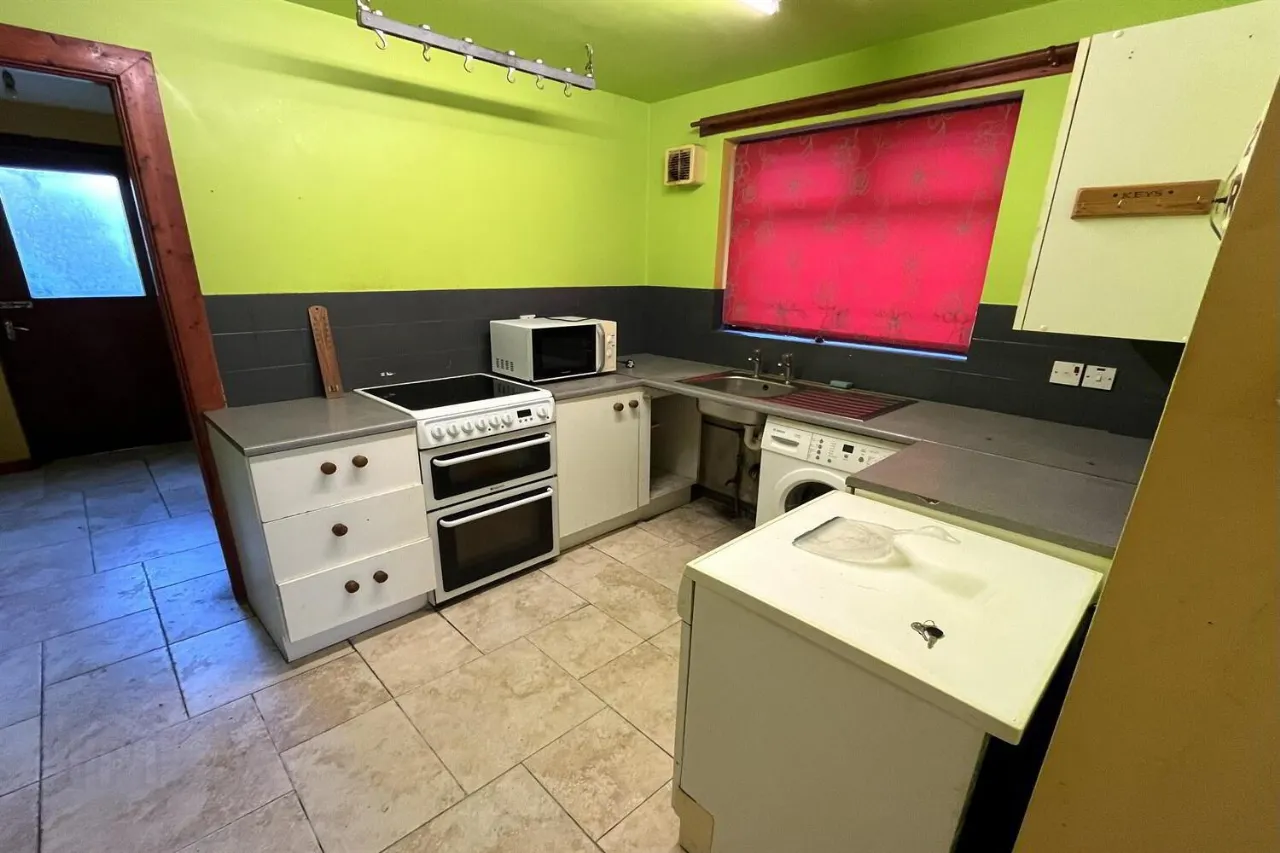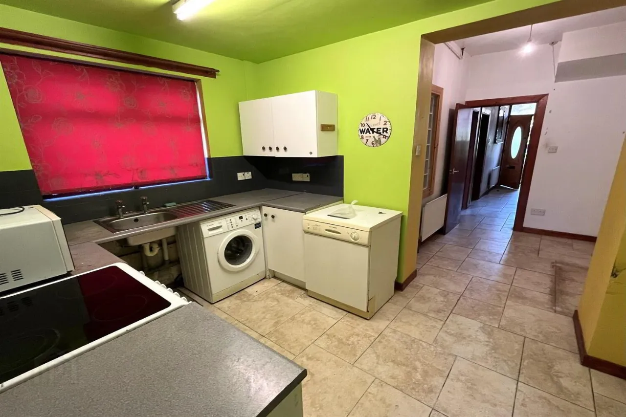 Ceramic tiled flooring, single panelled radiator, single bowl stainless steel sink unit, range of high and low level units, partially tiled walls, plumber for washing machine.