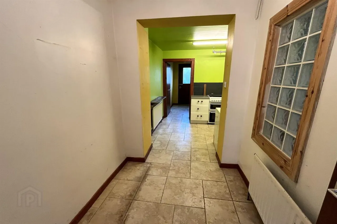 Ceramic tiled floor, single panelled radiator, cupboard containing electric fuse box, under stairs storage.