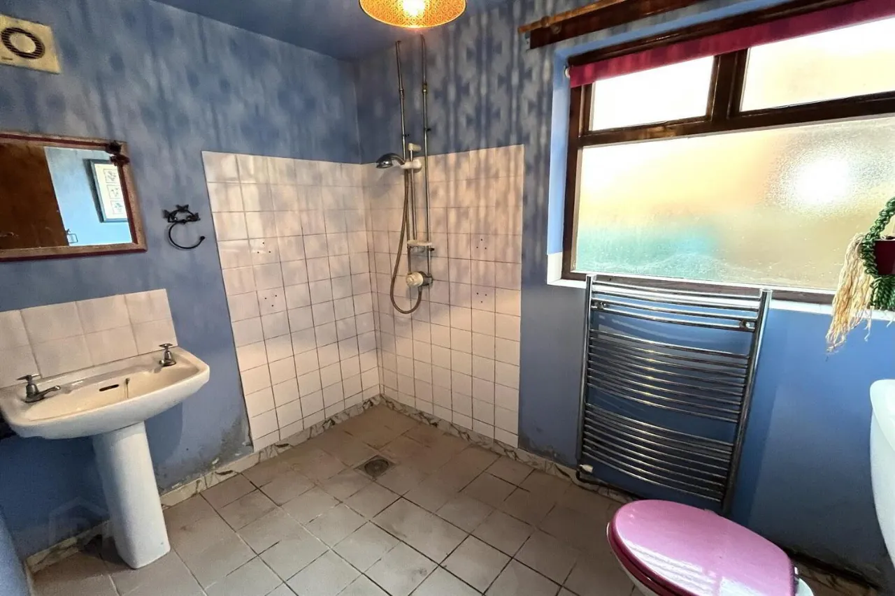 Ceramic tiled floor, partially tilled walls, white suite comprising, w.c., pedestal wash hand basin, thermostatically controlled shower.