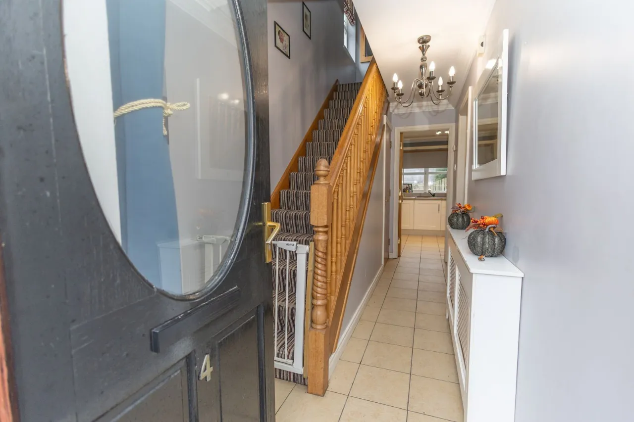 Wooden front door with glass window. Tiled flooring. Decorative radiator cover. Cloakroom with stairs leading to lower floor.
