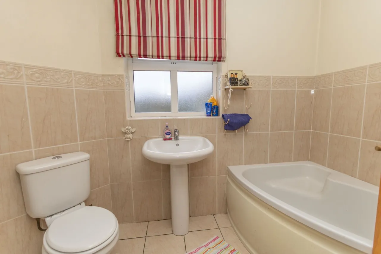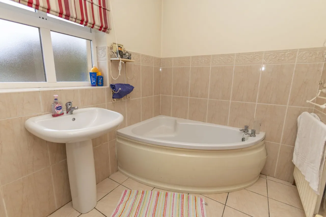 Tiled flooring. Partially tiled walls. Quadrant shower unit with a thermostat shower. Low flush wc. Pedestial sink. Corner bath. Extractor fan.