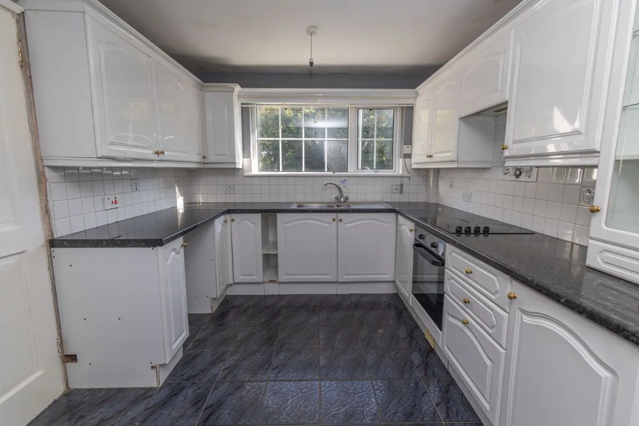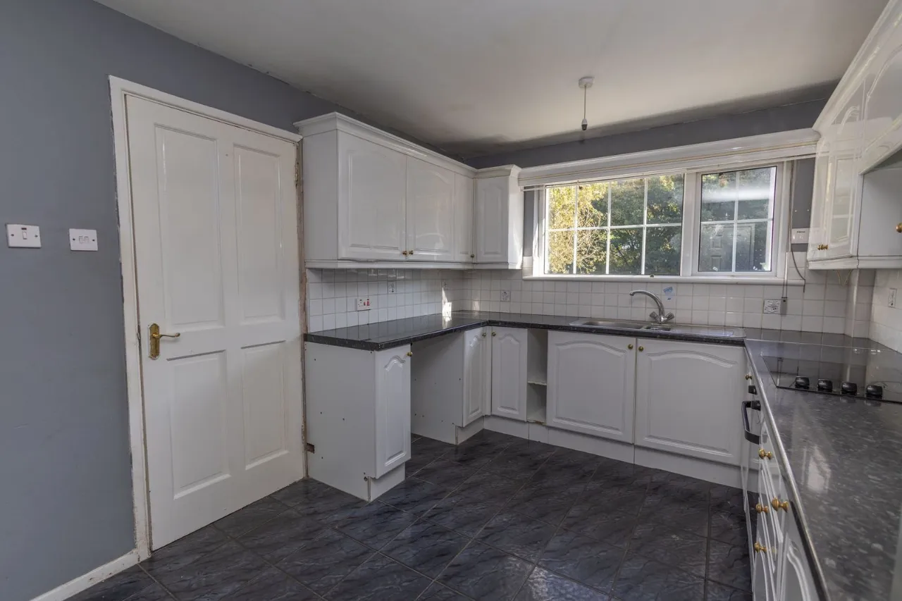 Tiled flooring. Partially tiled walls. High and low kitchen units with display cabinet. Electric hob and oven. Stainless steel sink.