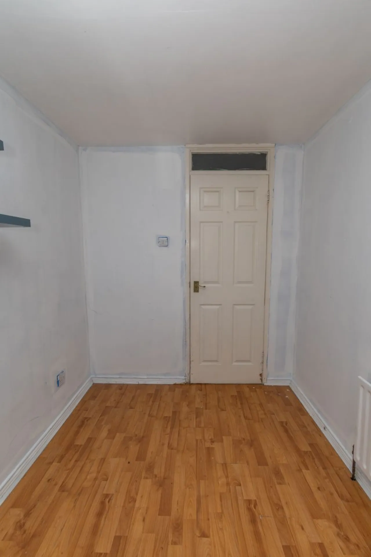 PVC door with glass decorative panel. Wooden flooring.