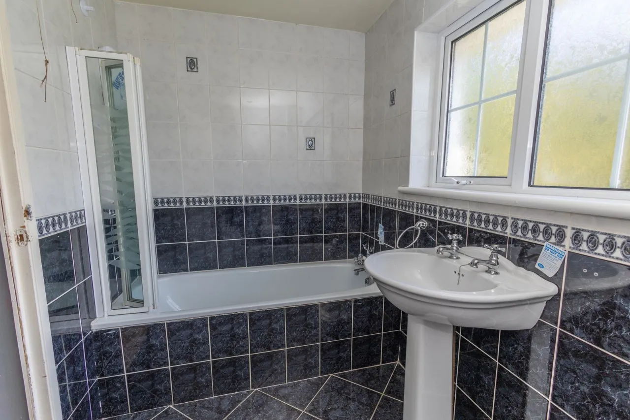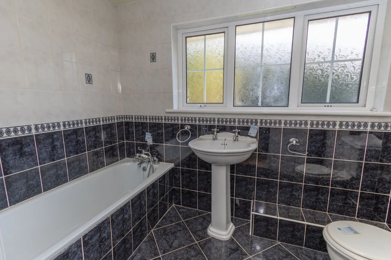 Tiled flooring. Fully tiled walls. Low flush wc. Pedestal sink. Bath with chrome taps and shower.