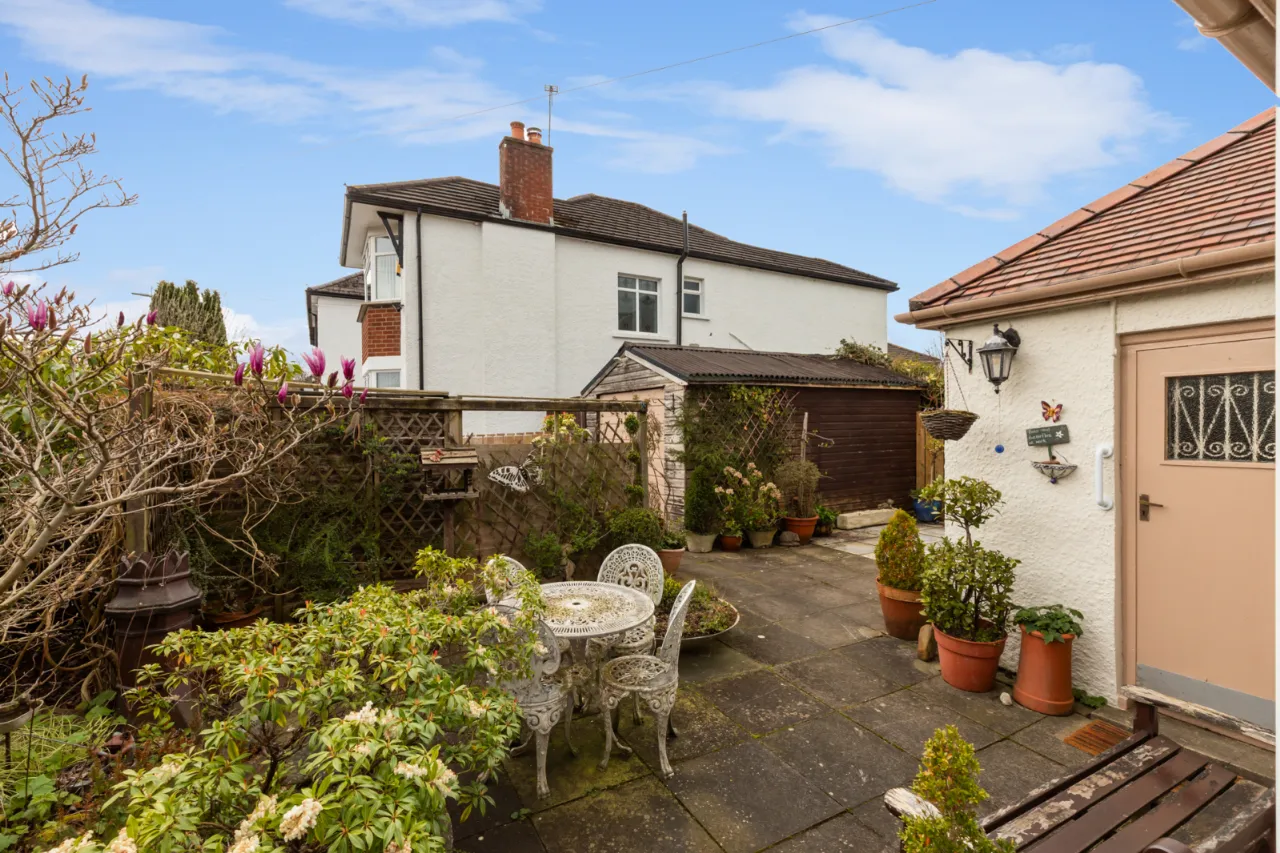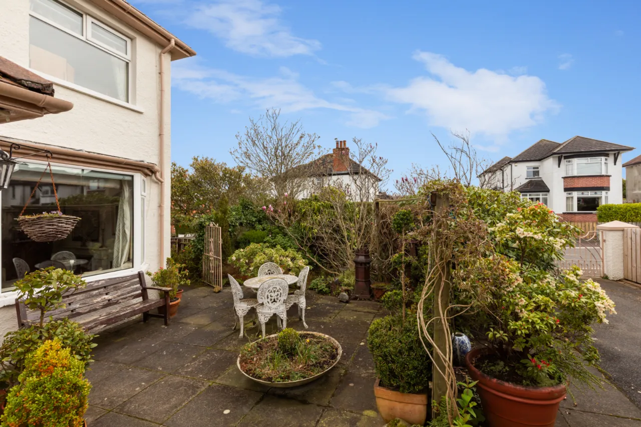 Driveway to the rear. Paved patio and garden to side.