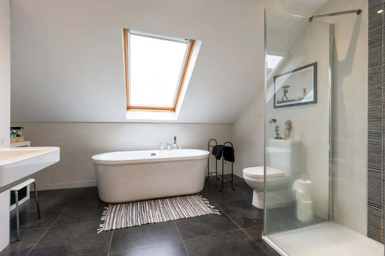 Oval bath with mixer taps, low flush WC, vanity sink unit, fully tiled shower cubicle with overhead rain shower.