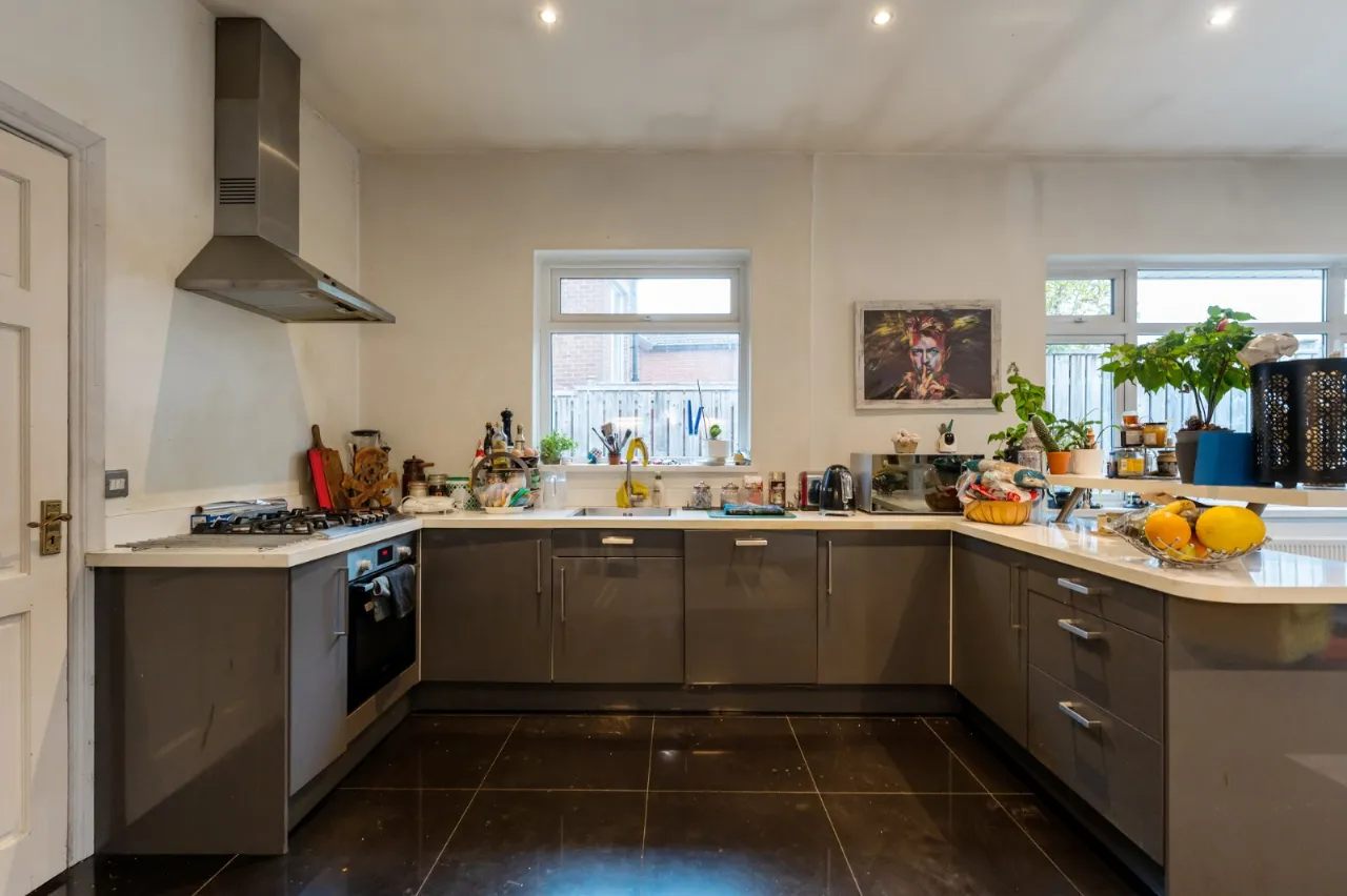 Full range of high and low level units, 5 ring stainless steel gas hob, under oven, stainless steel single drainer sink unit with mixer taps, built in dishwasher, ceramic tiled floor, French double doors to rear.