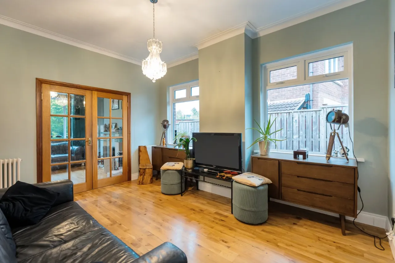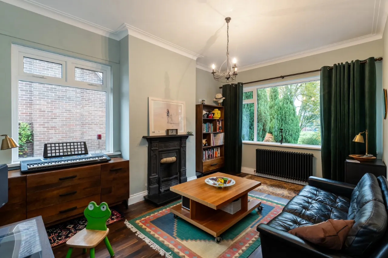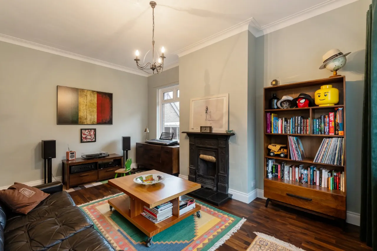 Cast iron fireplace with open fire, Junckers flooring, corniced ceiling.