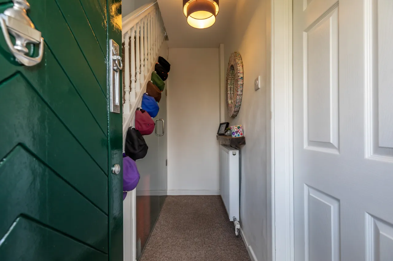 Hardwood front door with glass inset, leading through to reception hall.