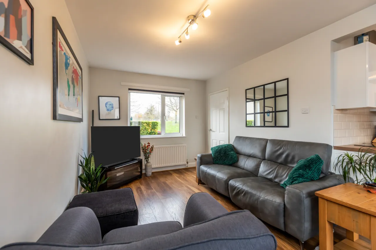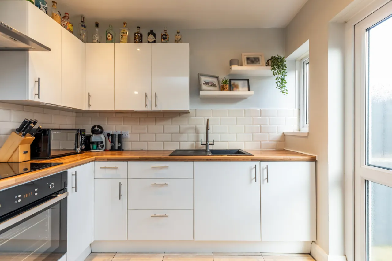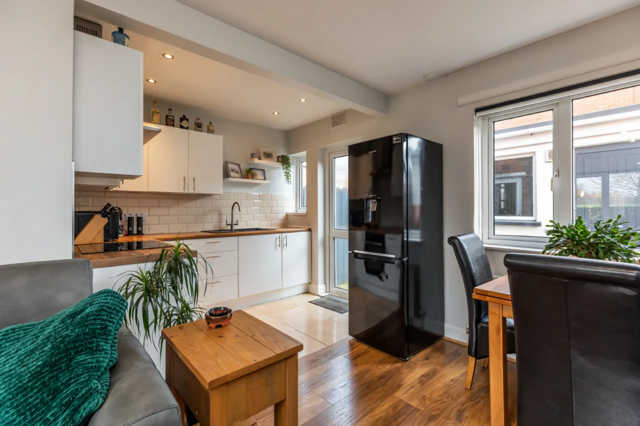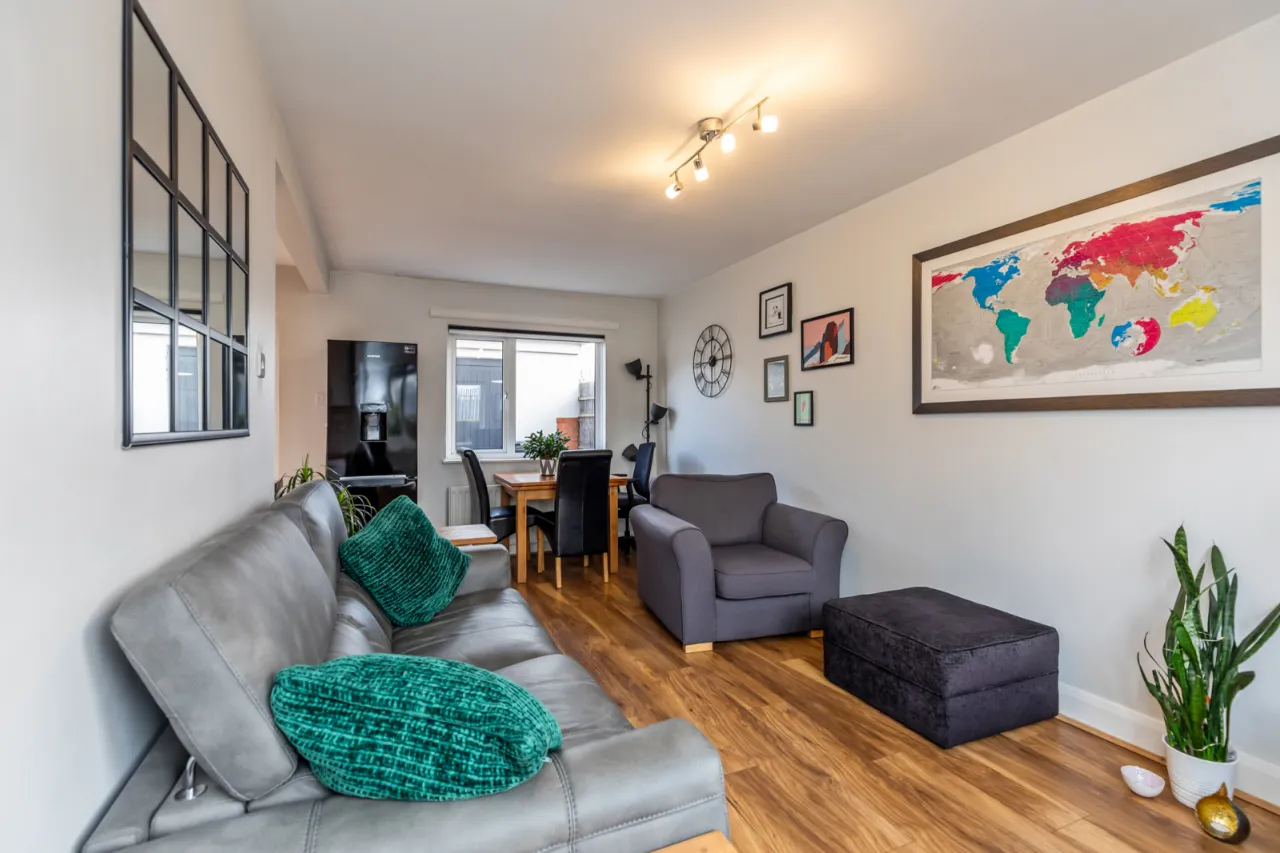 Gloss hand and low level units, laminate work surfaces with sink unit and drainer 1 tub with mixer tap, integrated Beko oven, four ring hot point electric hob above, stainless steel extractor fan, space for fridge freezer, partly tiled walls, tiled flooring, recessed spotlighting, access to rear garden. Living Dining Area with laminate wood effect flooring, dual aspect to front and rear.