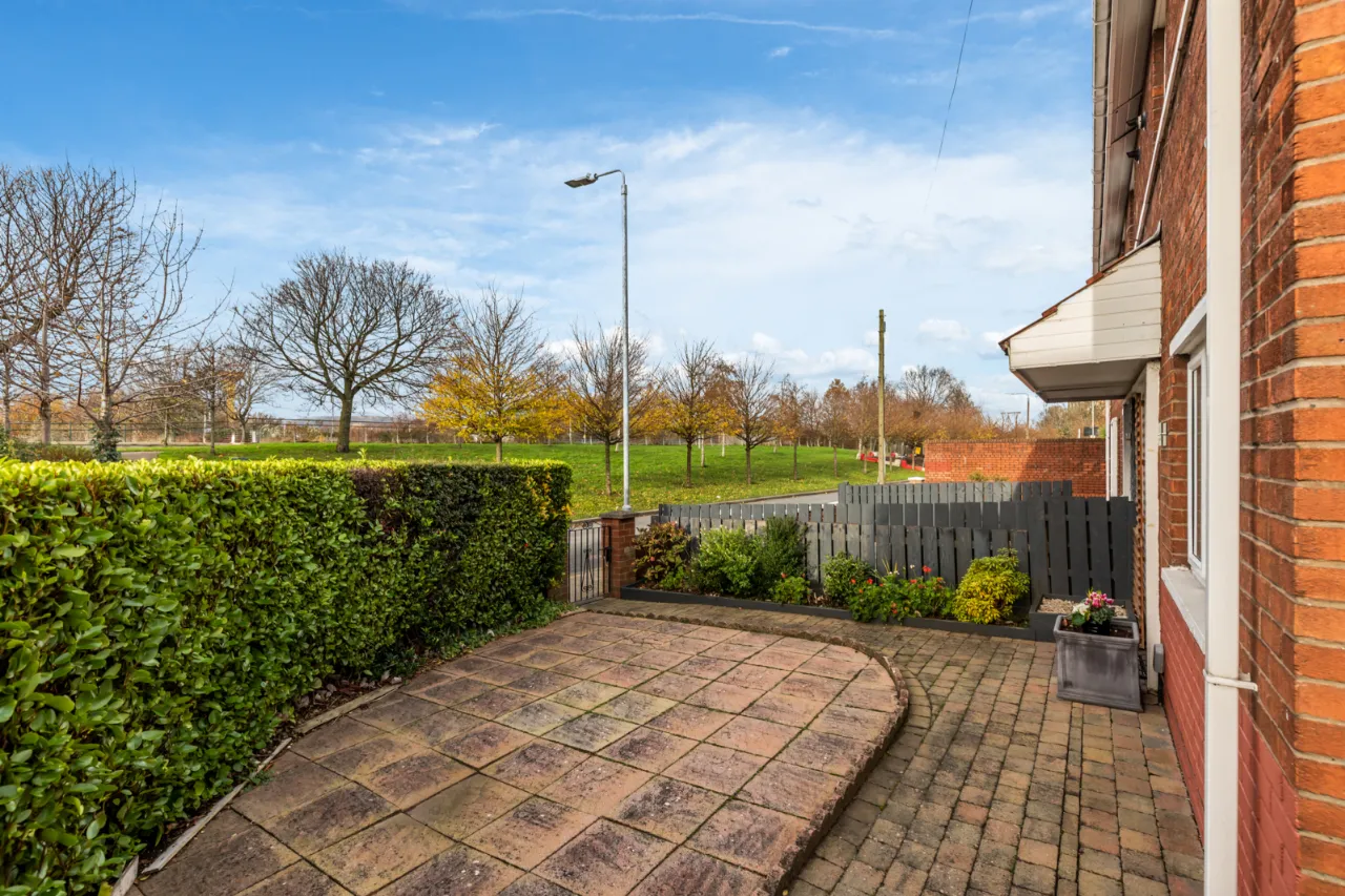 Paved patio, mature hedging to front. Side garden laid in brick paver, mature hedging, driveway.
