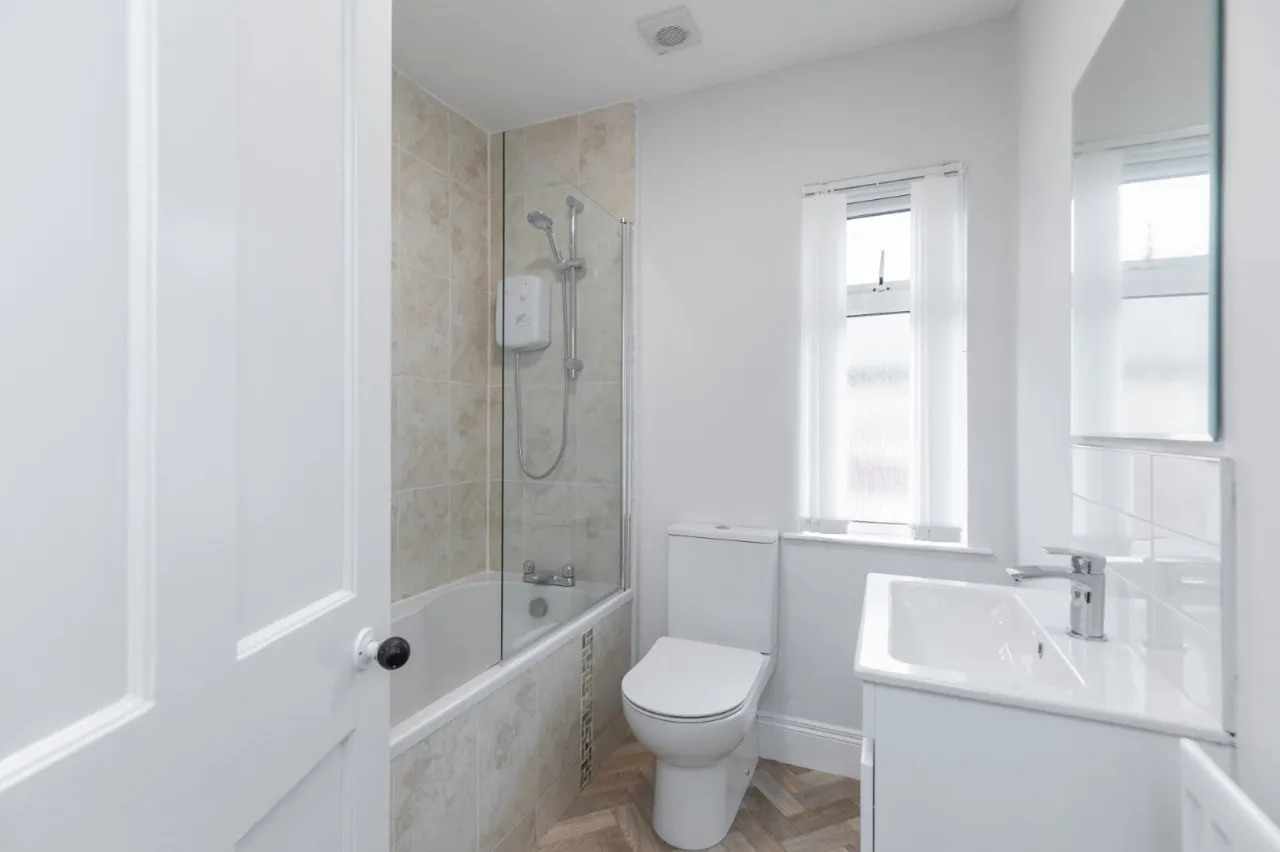 White suite, panelled bath, mixer taps, telephone hand shower, WC and wash hand basin