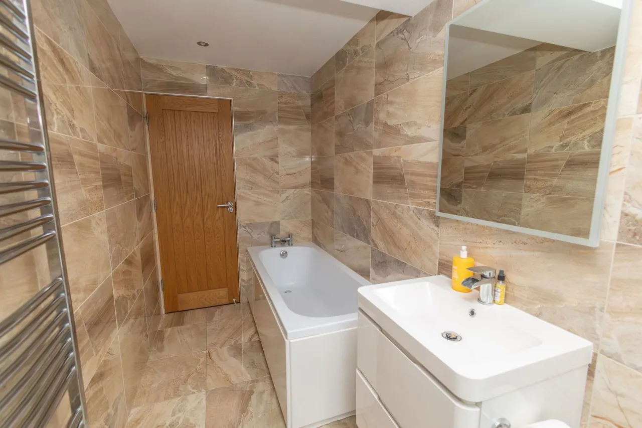 Tiled flooring. Fully tiled walls. Recessed lighting. Bath with chrome taps. Sink with vanity unit. Thermostat shower with glass panels. Low flush wc. Wall mounted chrome radiator.