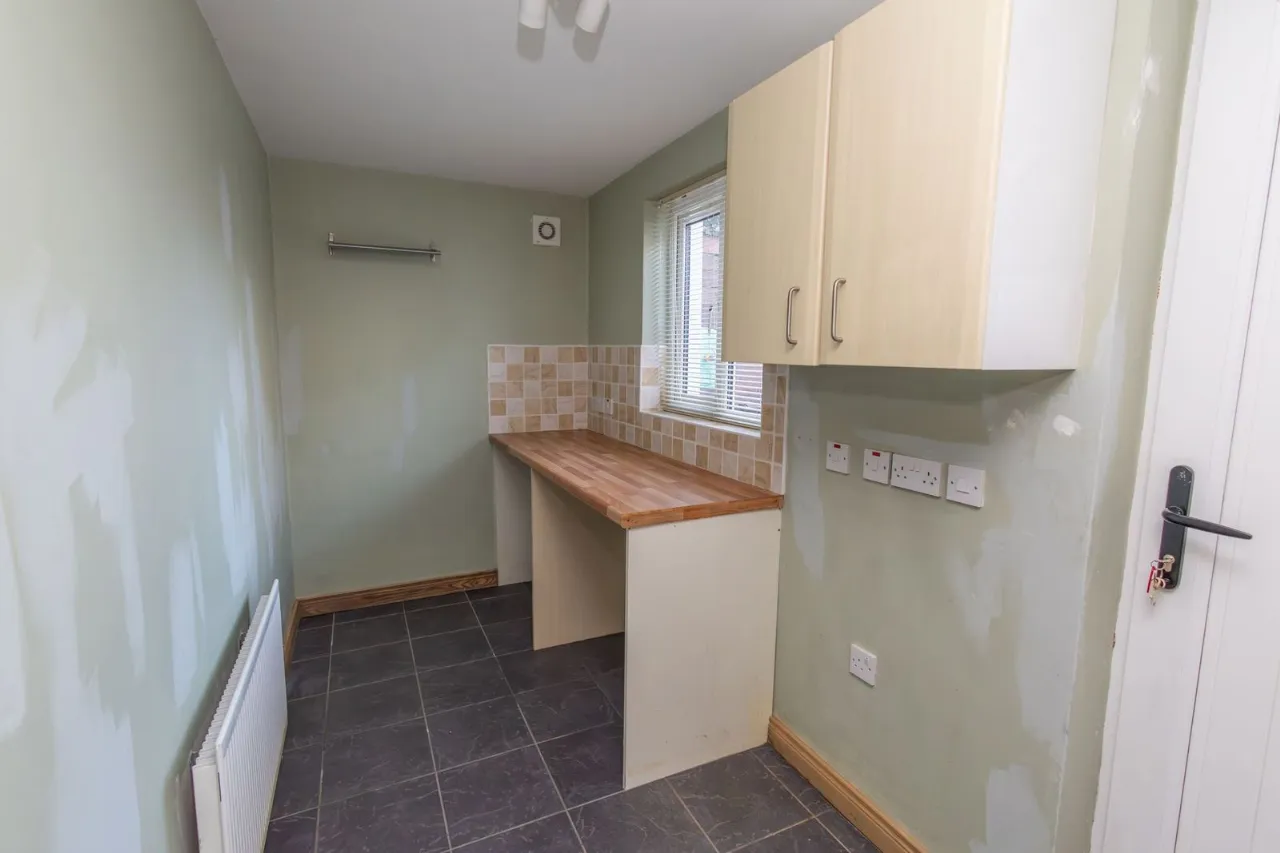 Tiled flooring. Partially tiled walls. Wall mounted cupboard. Workbench. Plumbed for laundry. External PVC door to rear.