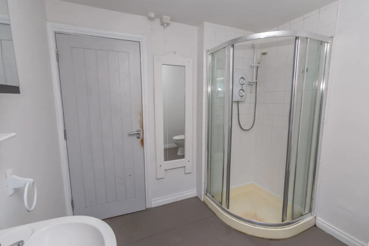 Vinyl flooring. Partially tiled walls. Quadrant shower unit with electric shower. Low flush wc. Pedestal sink. Wall-mounted cabinet with mirror.