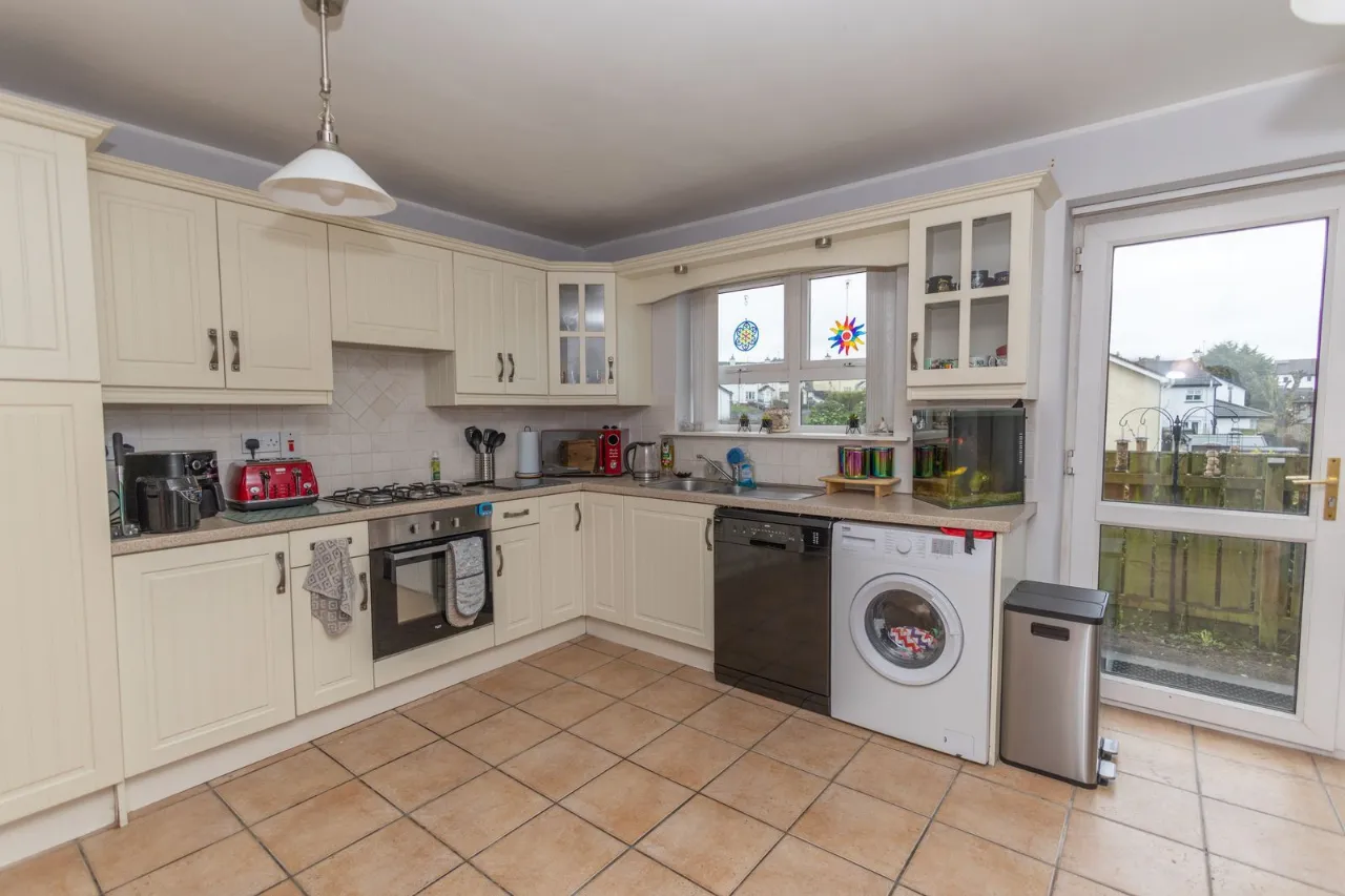 Range of high and low level untis. Plumbed for washing machine .Gas hob, electric over and extractor fan. Stainless steel sink unit. Tiled flooring and partially tiled walls. Immersion heater. Patio door leading to rear garden area