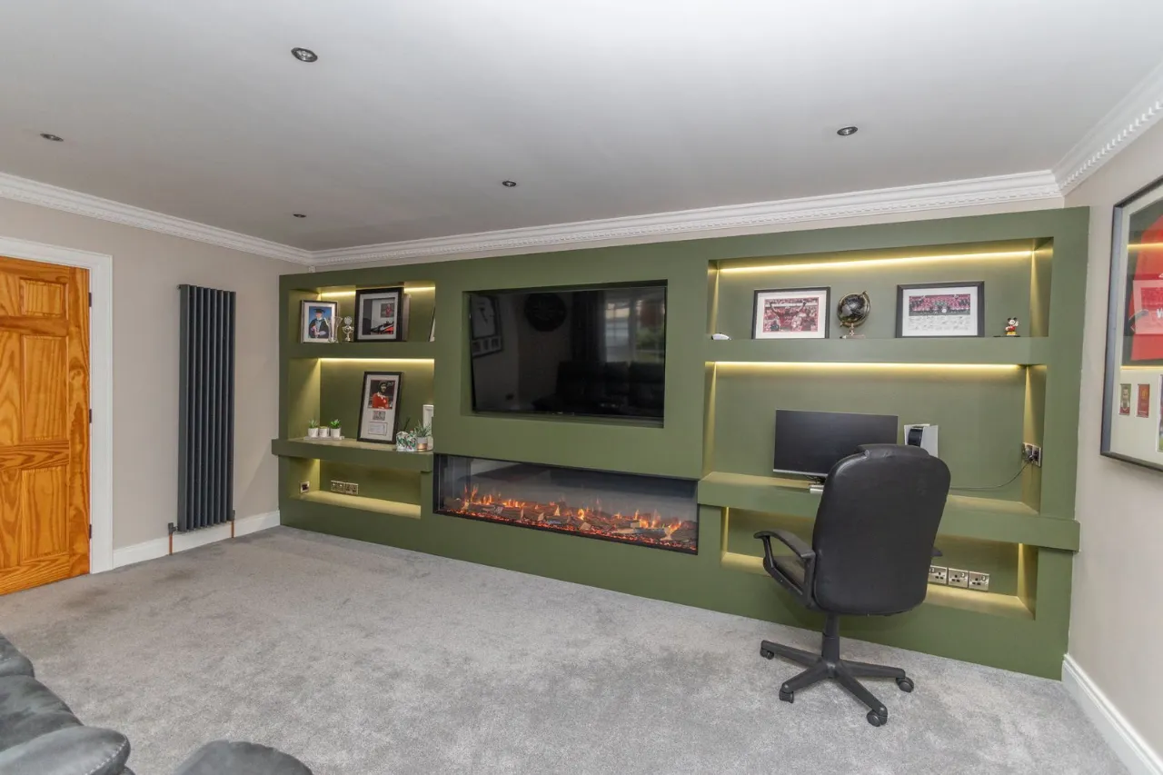 Carpet flooring. Recessed ceiling lights. Media wall with underlights and electric fire inset.