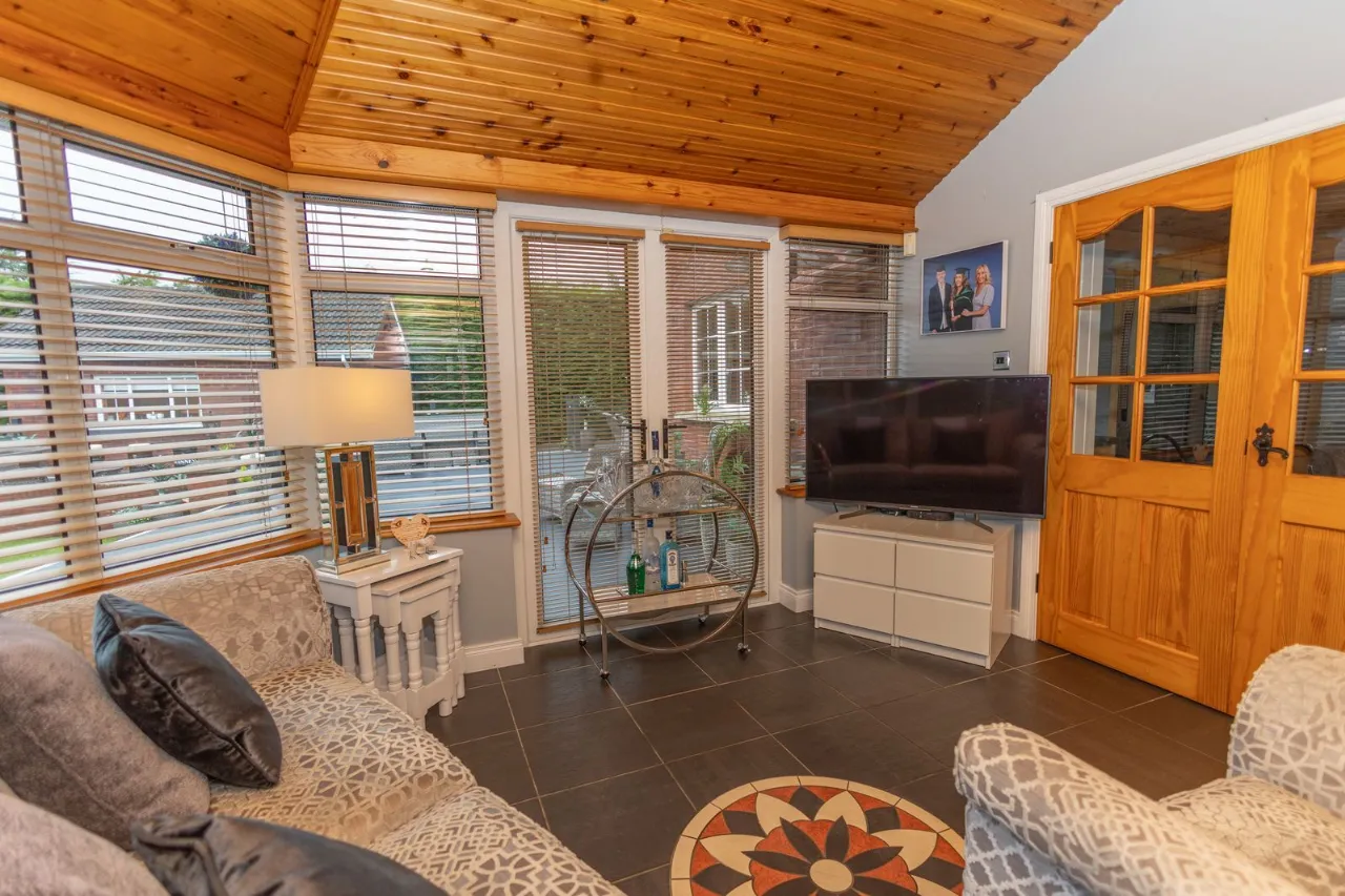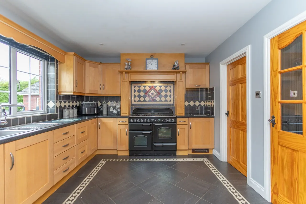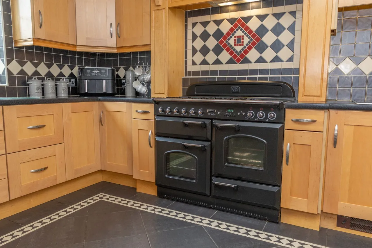 Tiled flooring with decorative border. Recessed ceiling lights. High and low solid wood kitchen units with display cabinets. 5 ring gas cooker. Electric ovens. Integrated deep fat fryer with extractor fan. American style fridge freezer. Integrated dishwasher. Instant boiling water tap. Double doors leading to sun room.