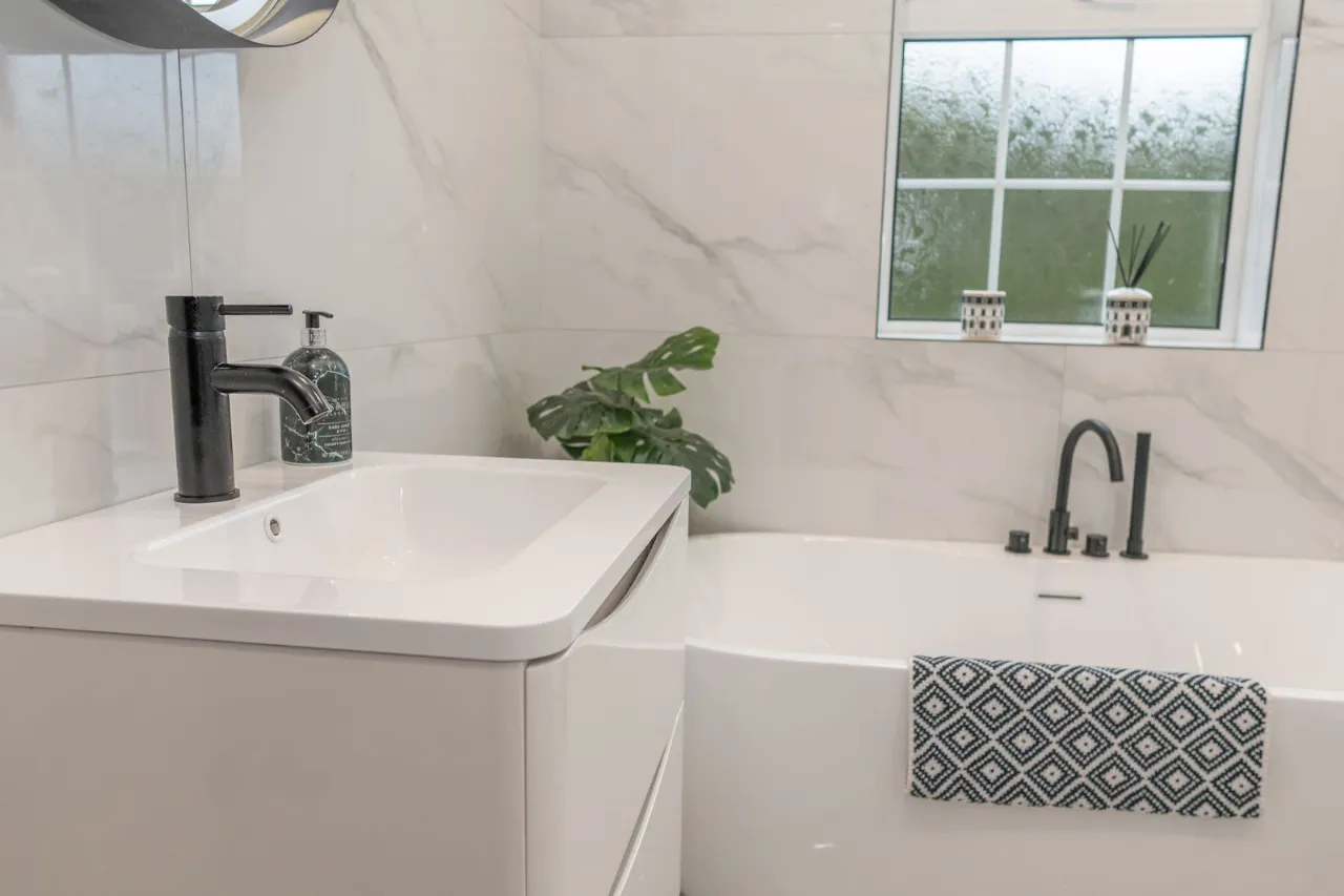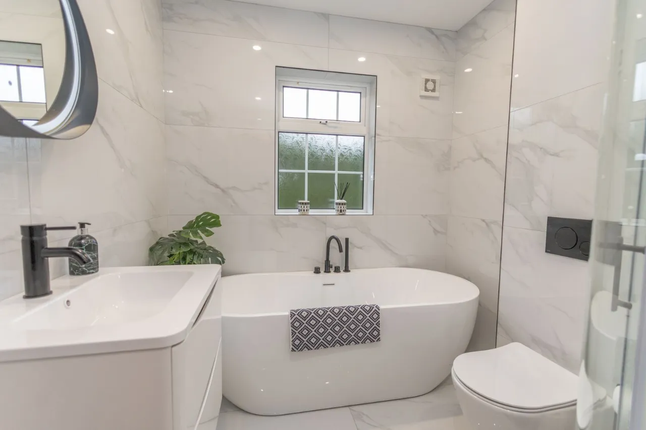 Tiled flooring. Fully tiled walls. Recessed ceiling lights. Wall hung sink with vanity unit and mirror. Bath with contemporary style tap and shower head. Low flush wc. Shower unit with thermostat shower and an built in shelf with lighting. Wall mounted radiator.