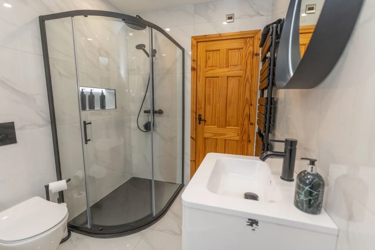 Tiled flooring. Recessed ceiling lights. Fully tiled walls with decorative border. vanity unit with sink, storage, mirror and light. Low flush wc. Quadrant shower unit with thermostat shower. Wall mounted chrome radiator.