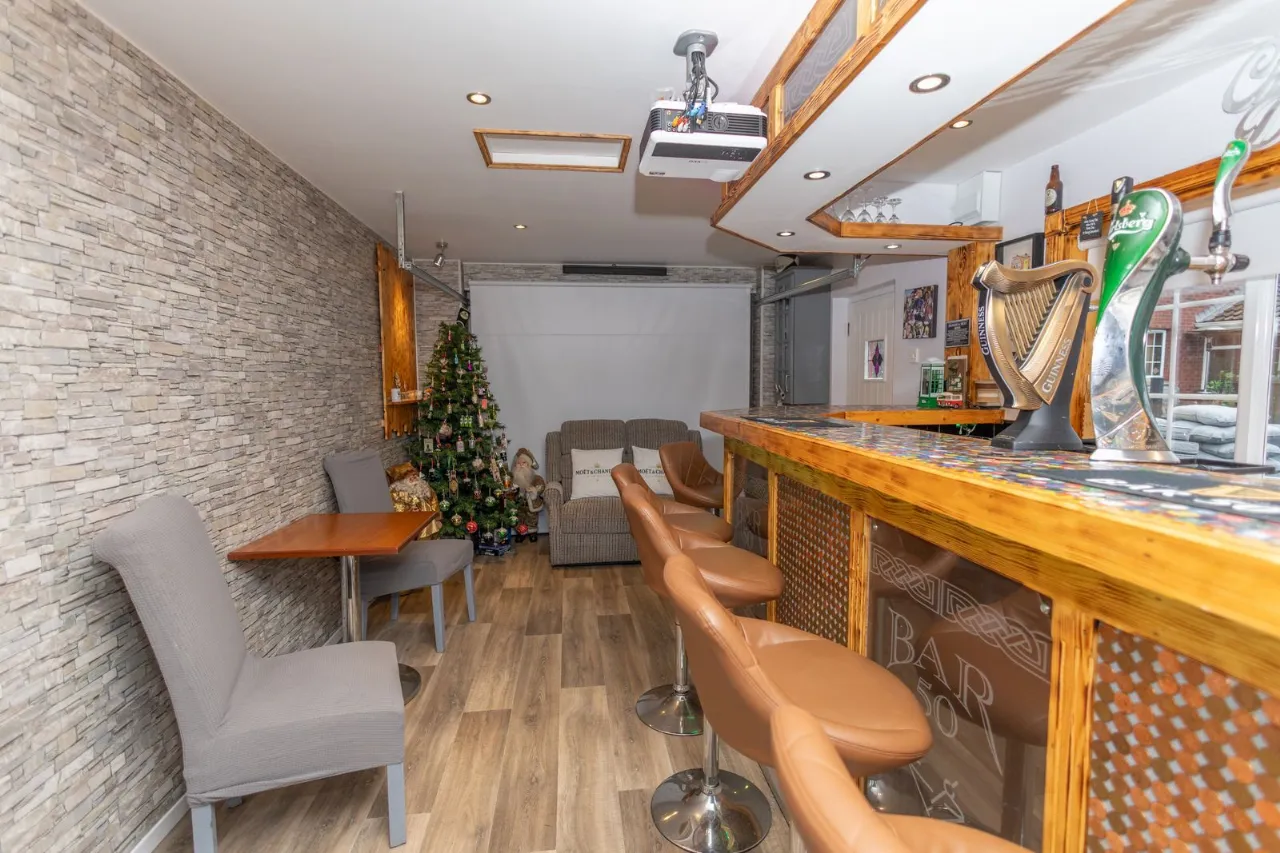 Converted to a home bar. Recessed ceiling lights. Vinyl flooring. Wooden bar counter. Garage roller door.