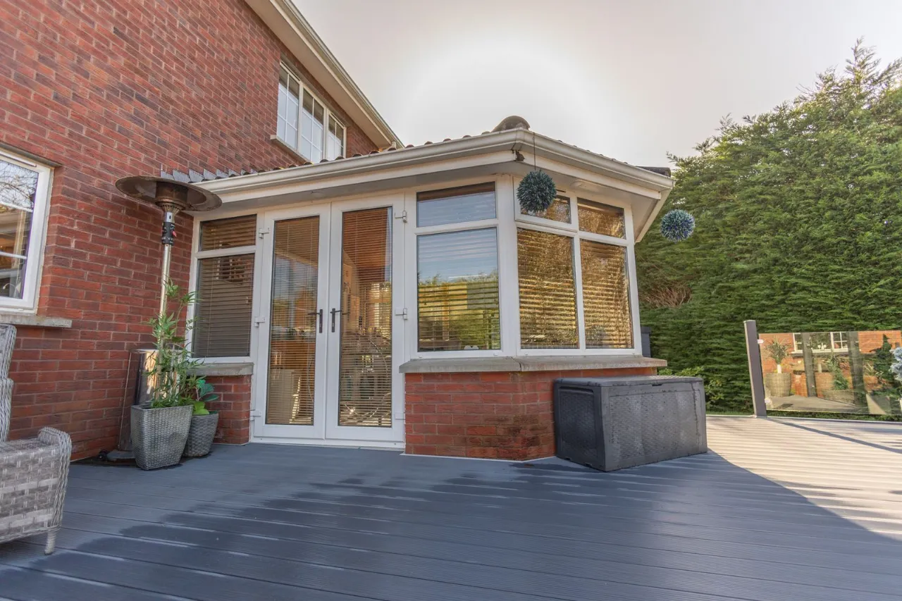 Corner site with enclosed gardens to the front, side and rear of property. Composite decking patio area to rear. Tarmacadem drive to front with electric gates.