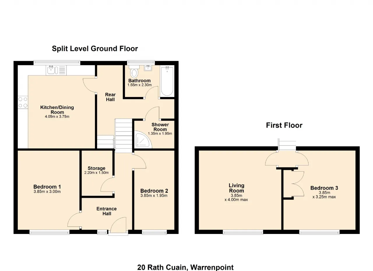 The property offers a bright living room, a functional kitchen/dining area, and two bathrooms, providing practical space for families or first time buyers.