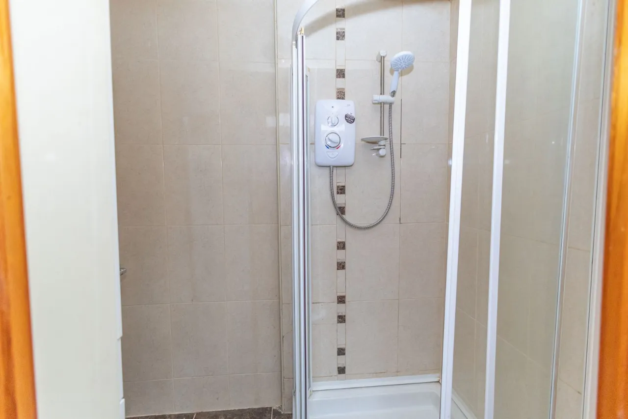 Walk-in electric shower. Heated towel rail. Fully tiled flooring and walls