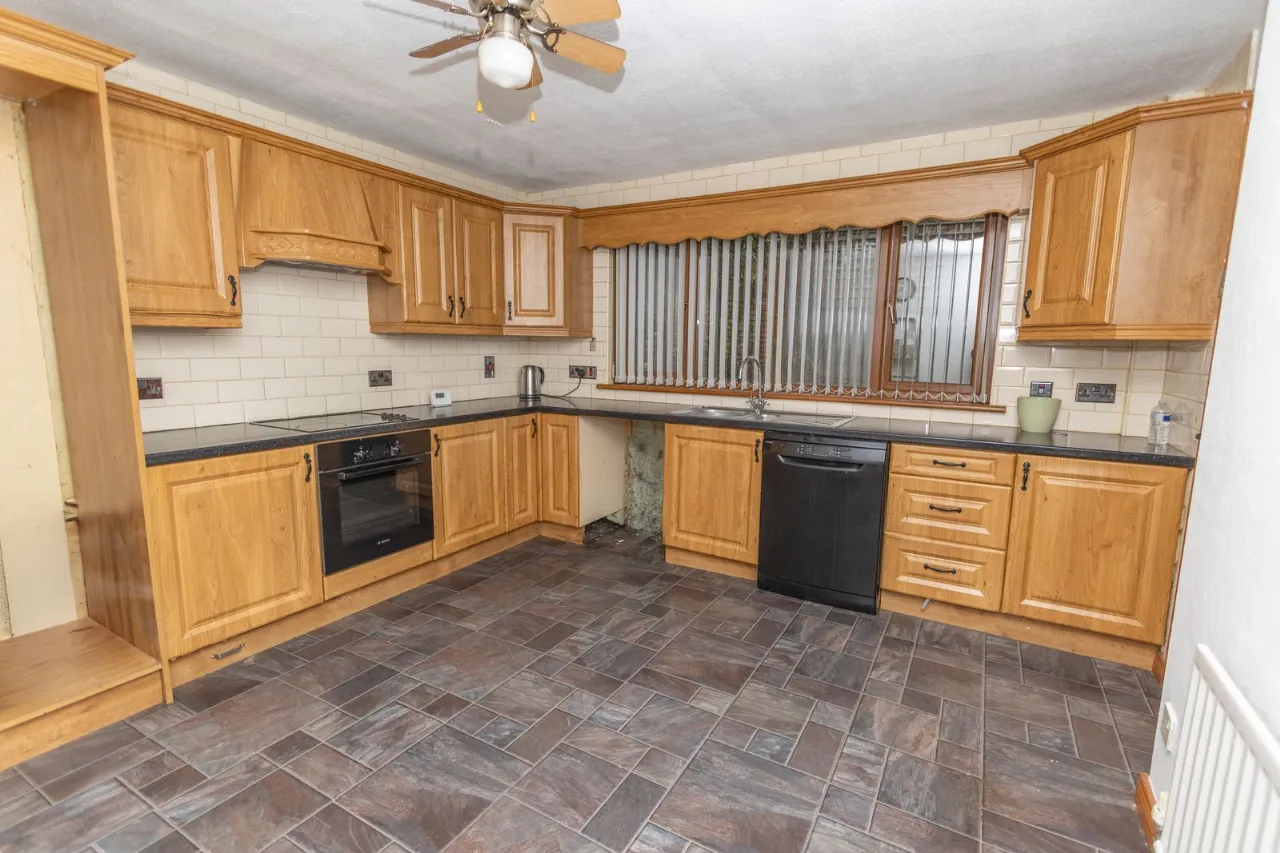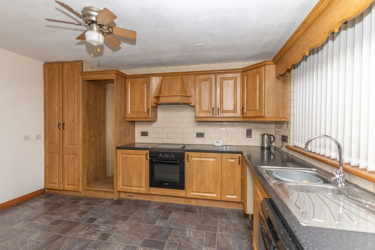 Range of high and low level units. Stainles steel sink unit with mixer taps. Hob, oven and extractor fan. Plumbed for washing machine. Tiled flooring and partly tiled walls. Double radiator