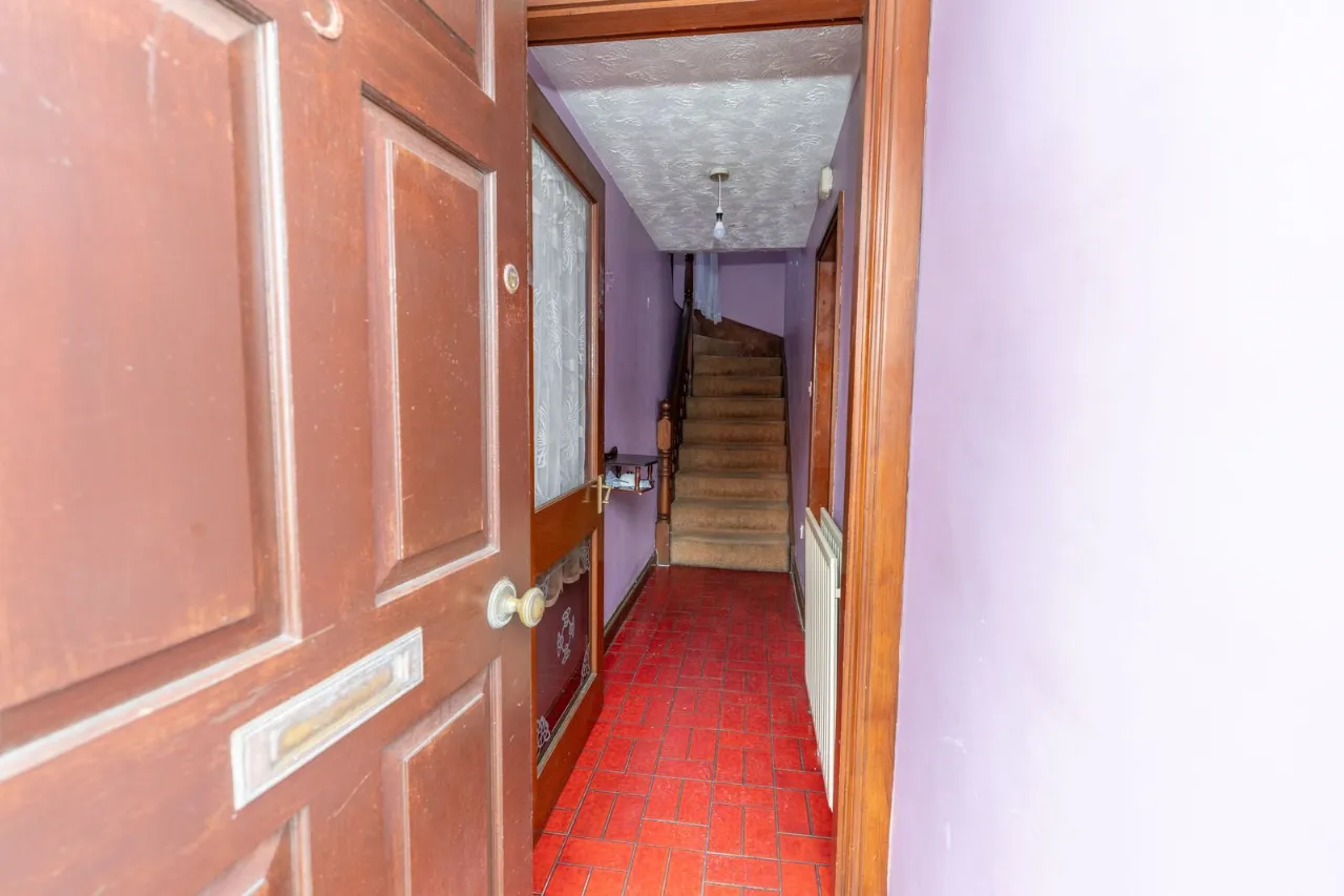 Door leading into main hallway. Tiled flooring. Teleh=phone point. Double radiator