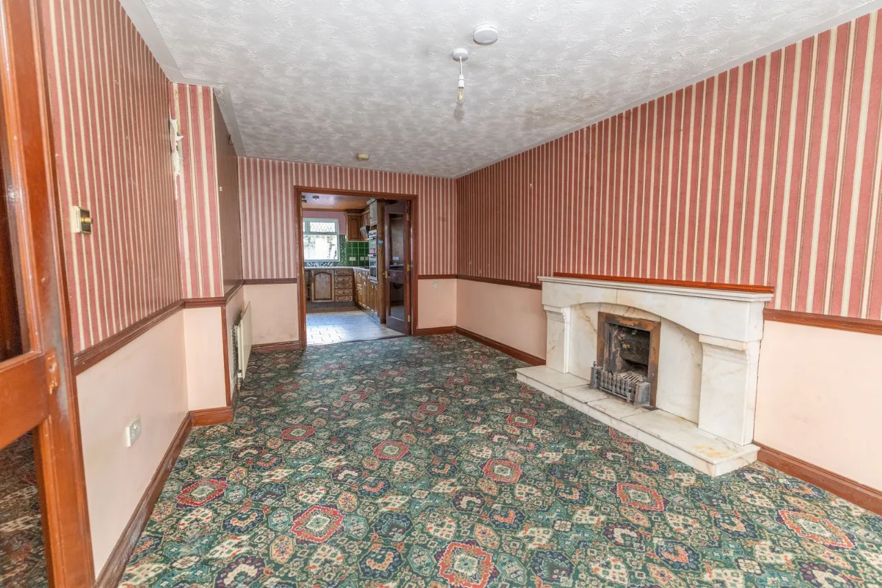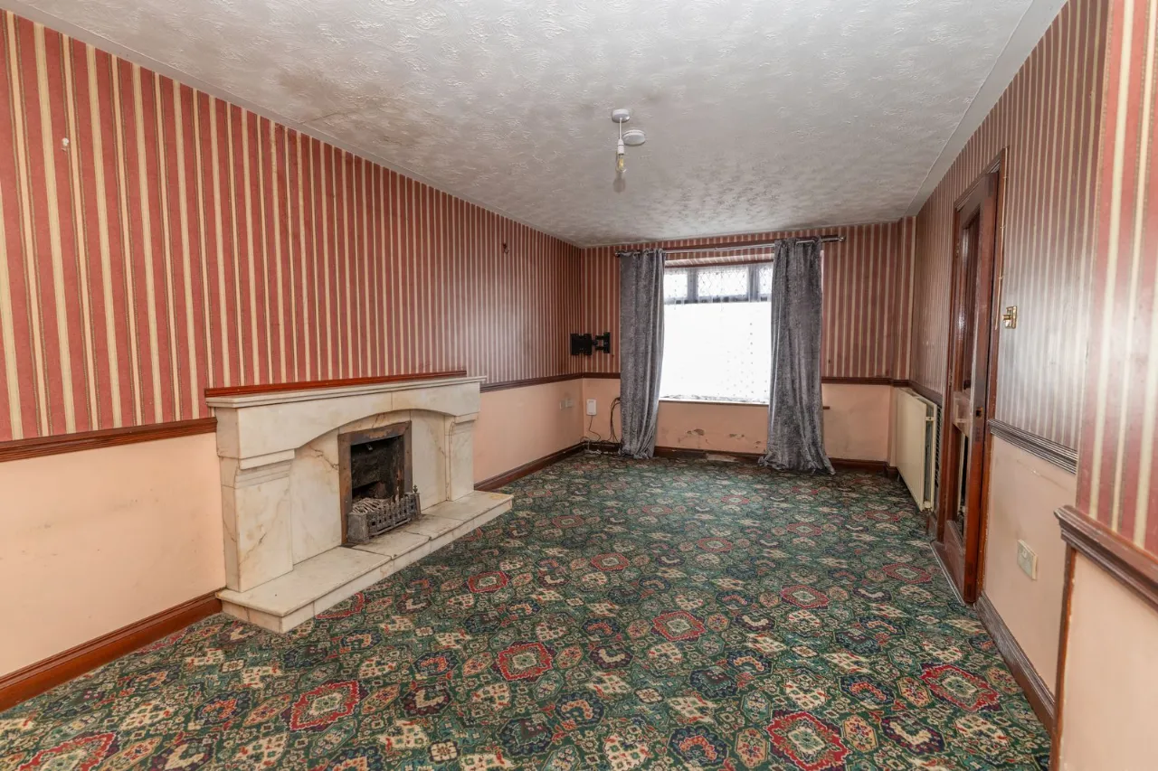 Carpet flooring. Open fire with marble surround and marble hearth. T.V. point. 2 double radiators