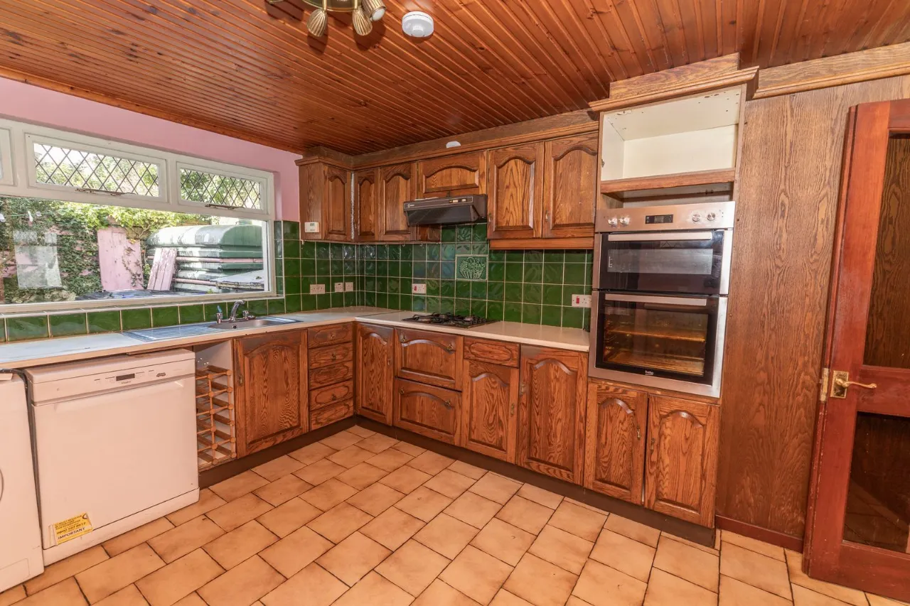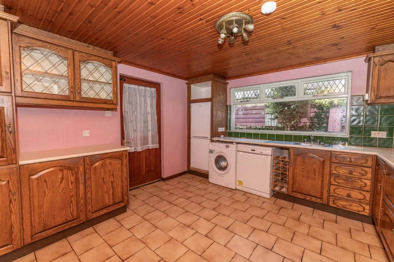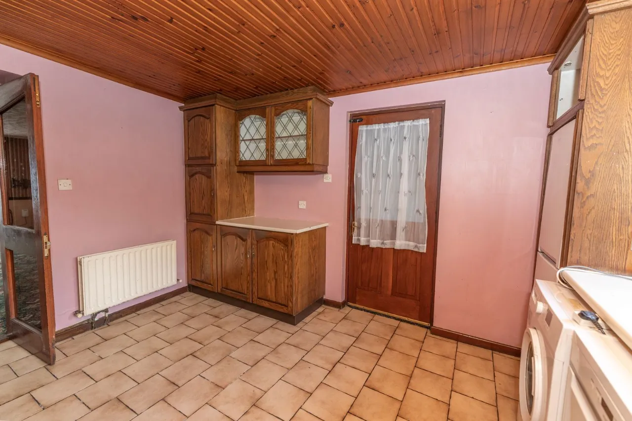 Range of high and low level units. Plumbed for washing machine. Stainless steel sink unit with mixer tap. Gas hob, electric oven and extractor dan. Tiled floorng. Partly tiled walls