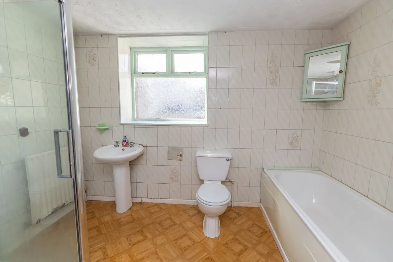3 piece bathroom suite. Walk-in electric shower. Linoleum flooring. Partly tiled walls. Hotpress