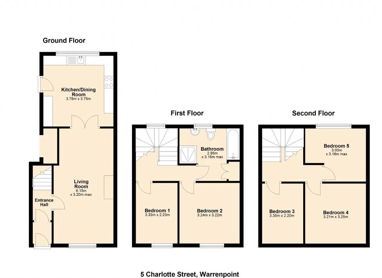 5 Charlotte Street, Warrenpoint is a five-bedroom mid-terrace property in need of modernisation, ideally located in the town centre.