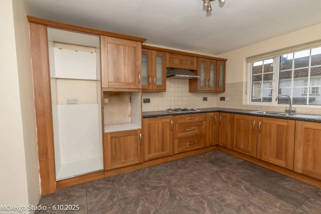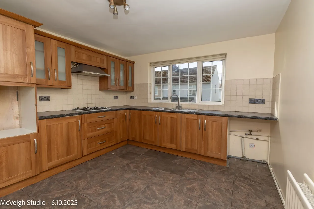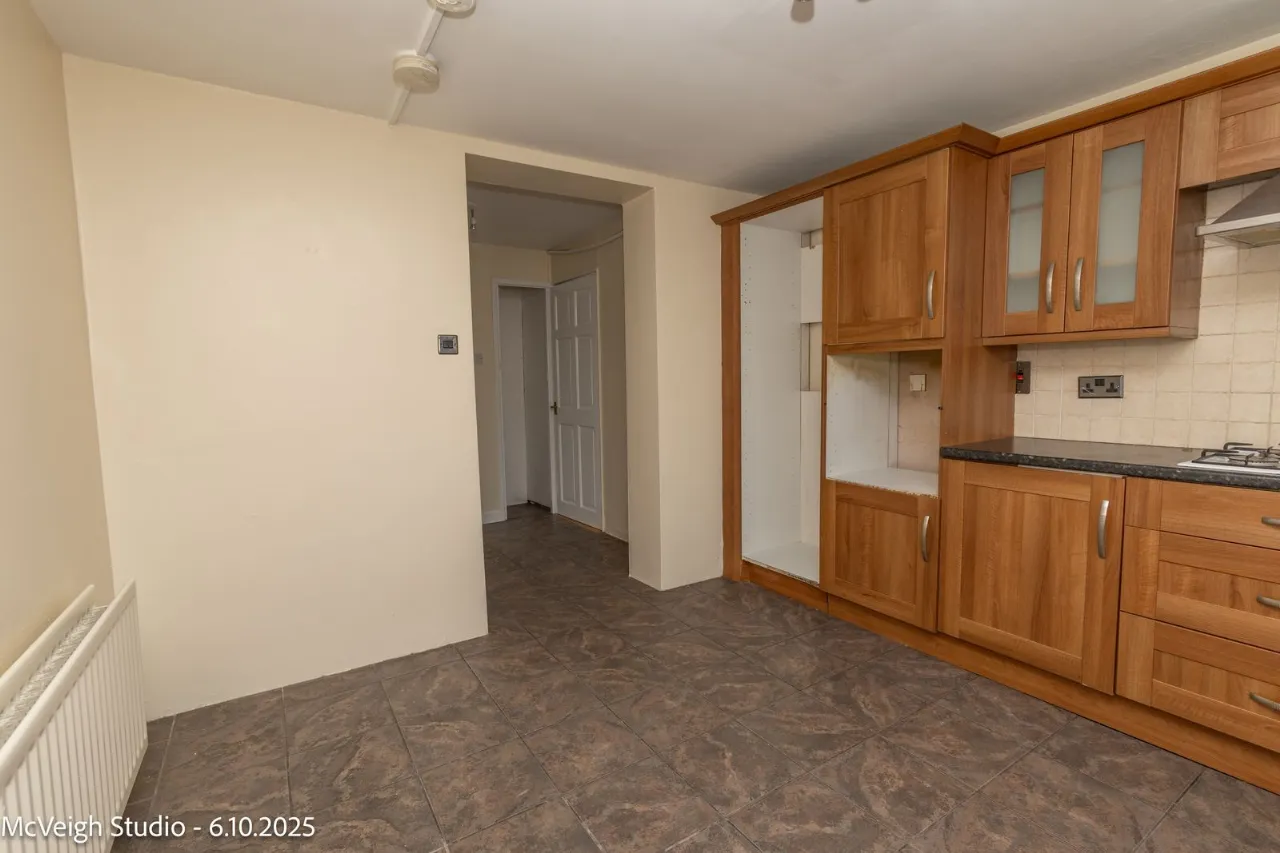 Range of high and low level units. Tiled flooring. Gas hob and extractor fan. Stainless steel sink unit with mixer taps. Plumbed for washing machine/Dish Washer