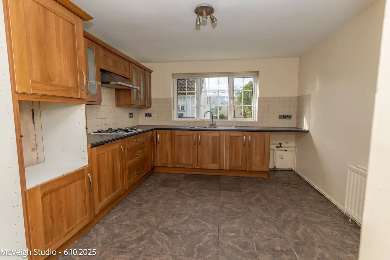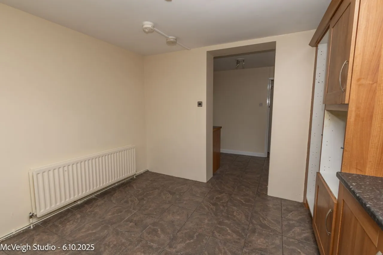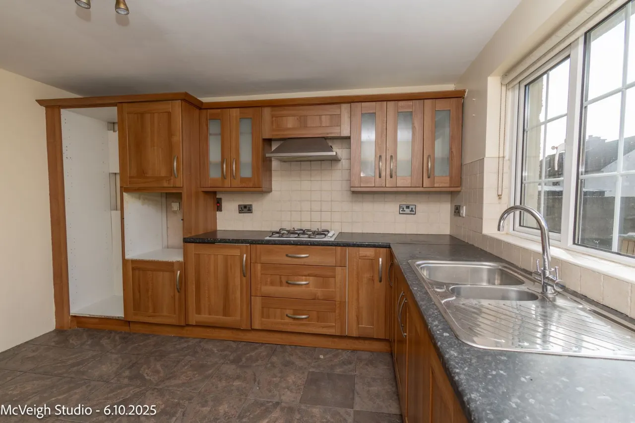 Range of high and low level units. Tiled flooring. Gas hob and extractor fan. Stainless steel sink unit with mixer taps. Plumbed for washing machine/Dish Washer