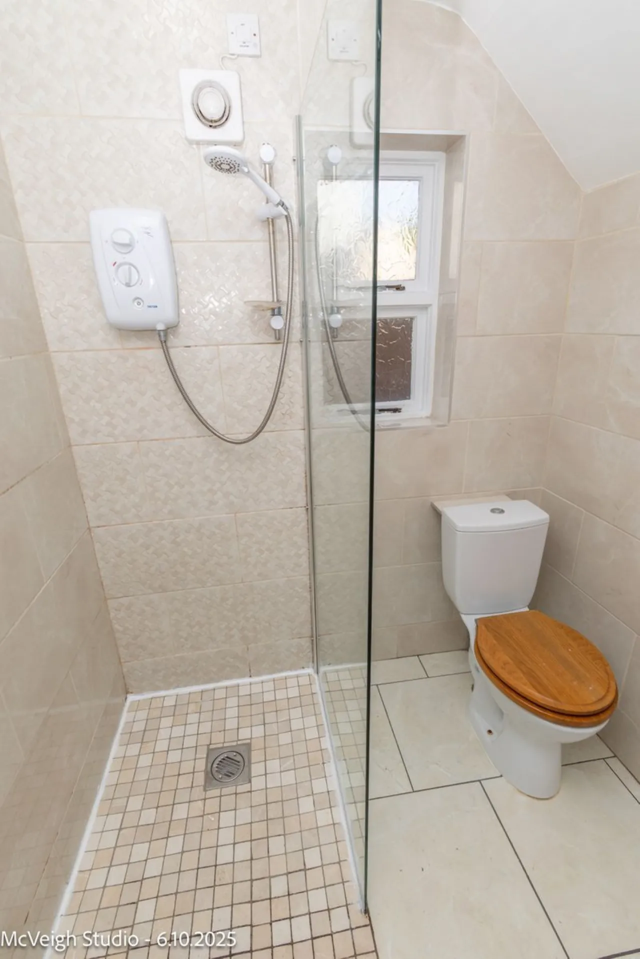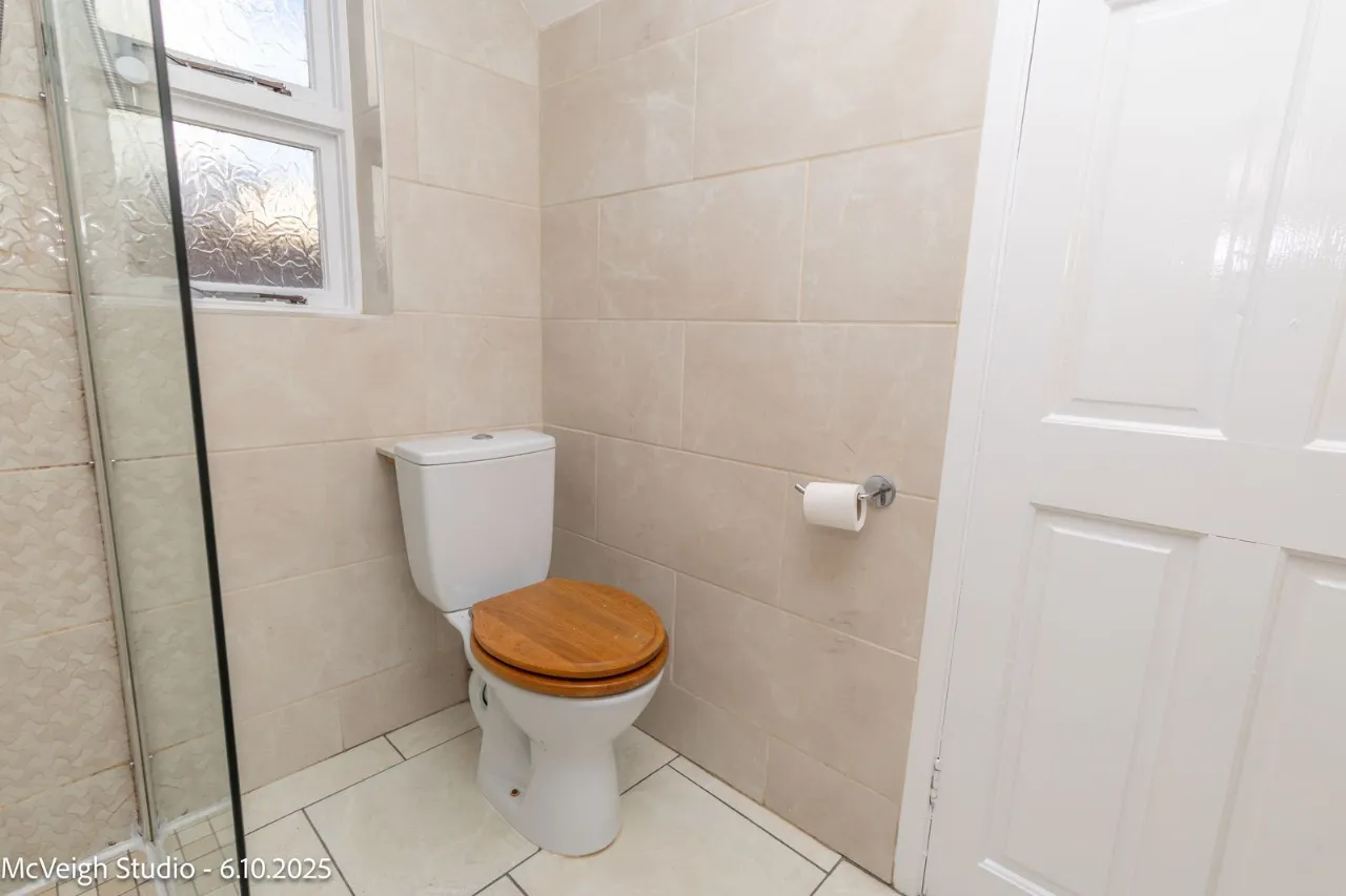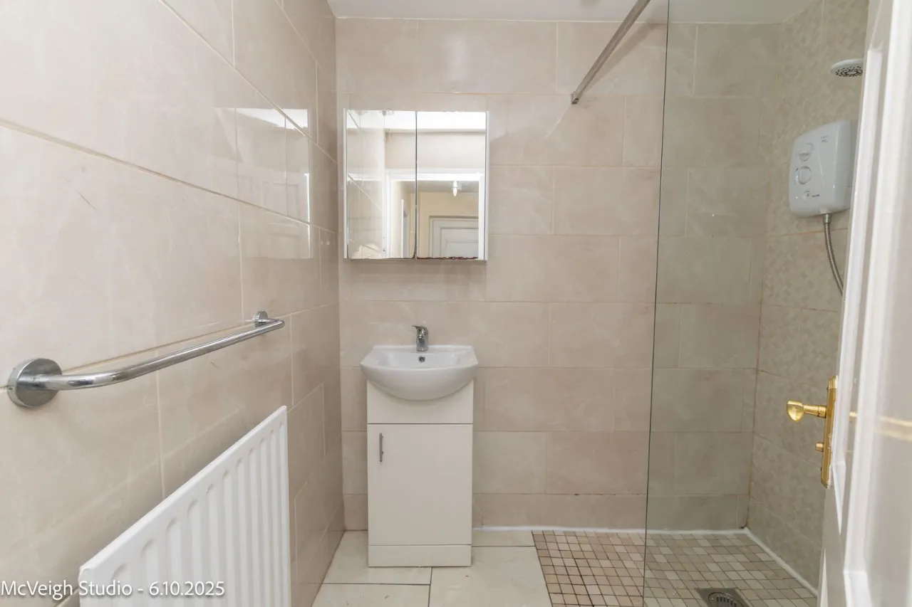 Walk in electric shower. Toilet and wash hand basin. Small storage cupboard under sink. Wall mirrored cabintt Tiled flooring and fully tiled walls.
