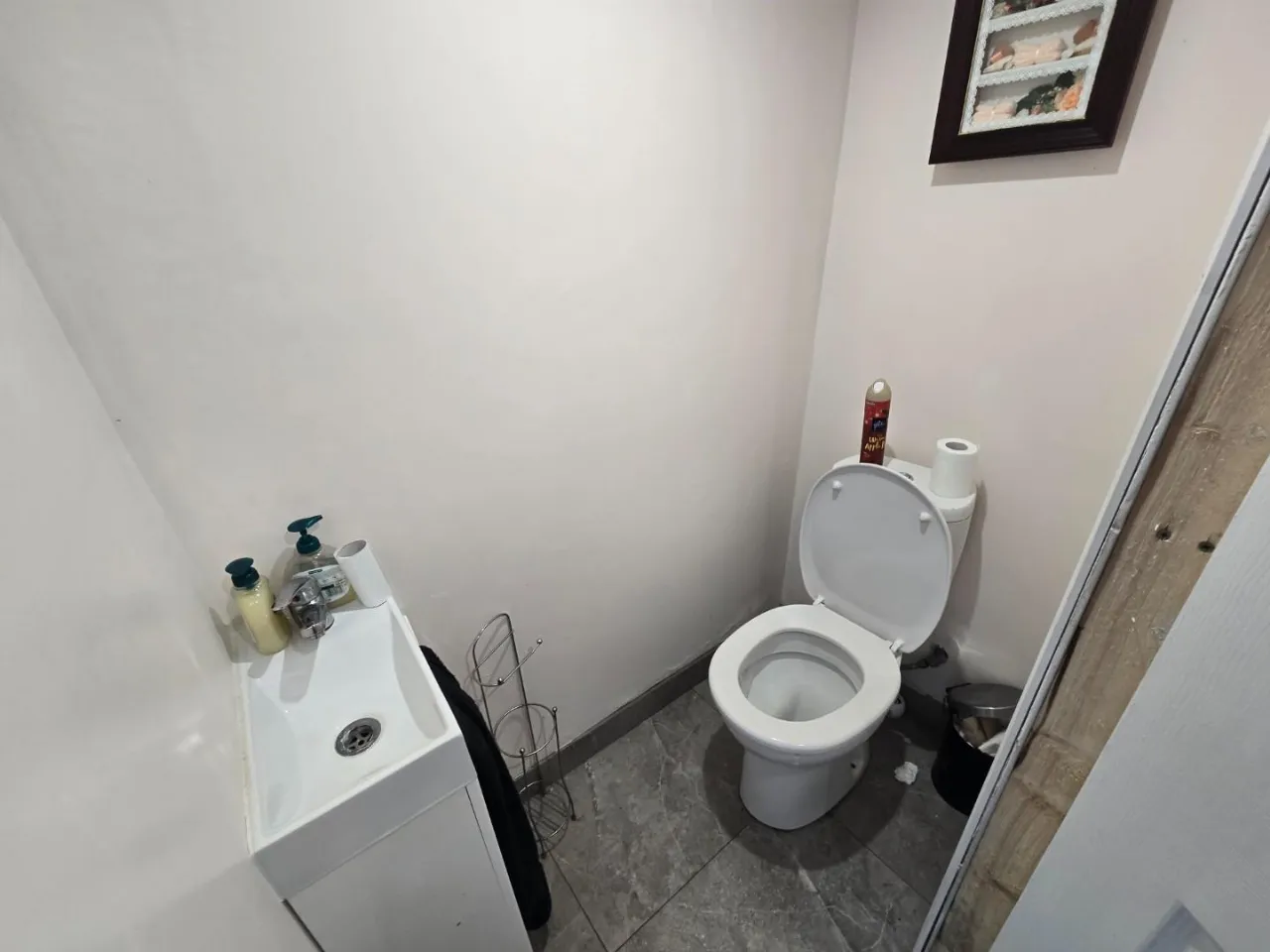 Tiled floor, Electric shower, Toilet, Sink and pedestal, Single glaze windows.