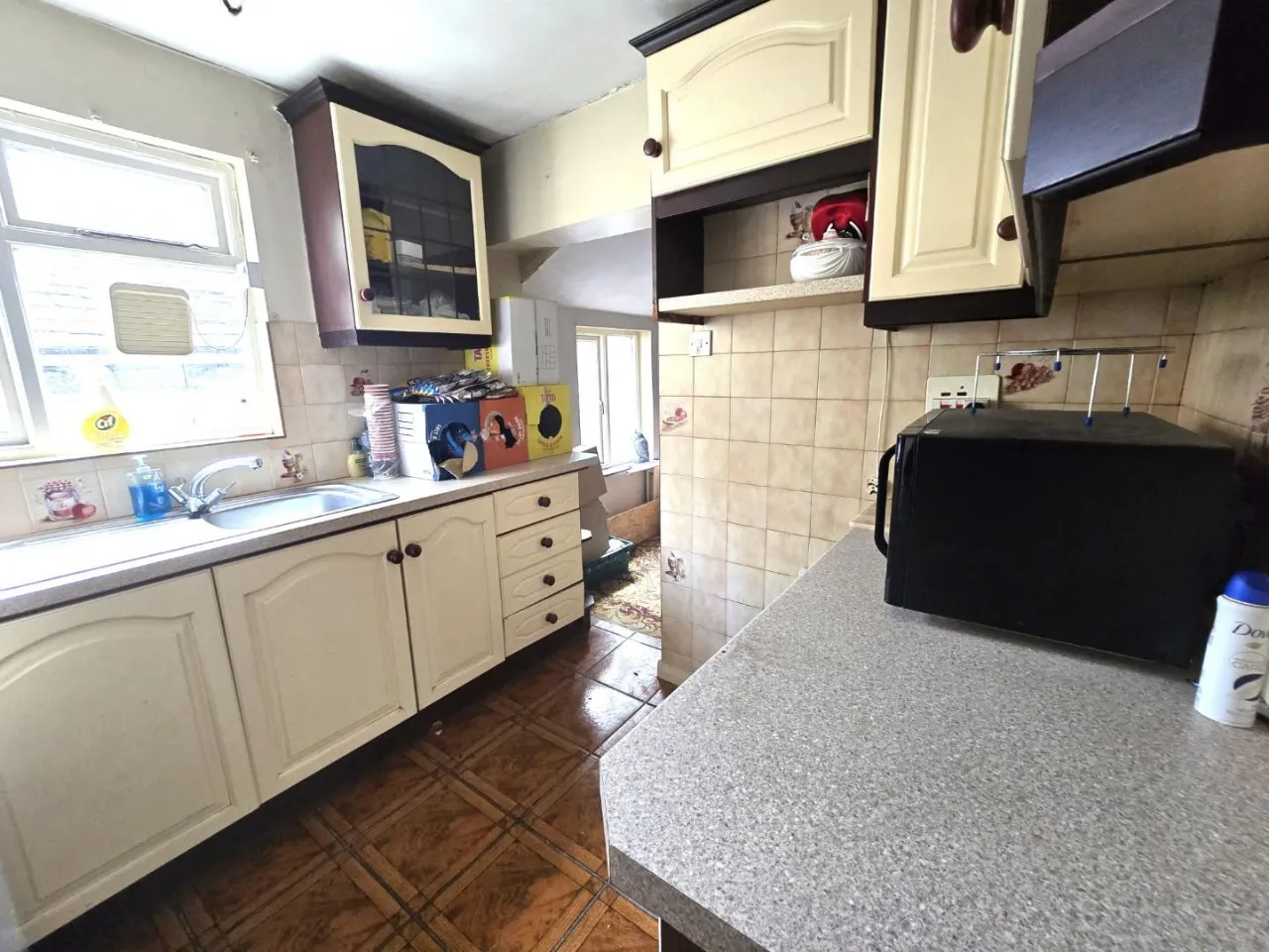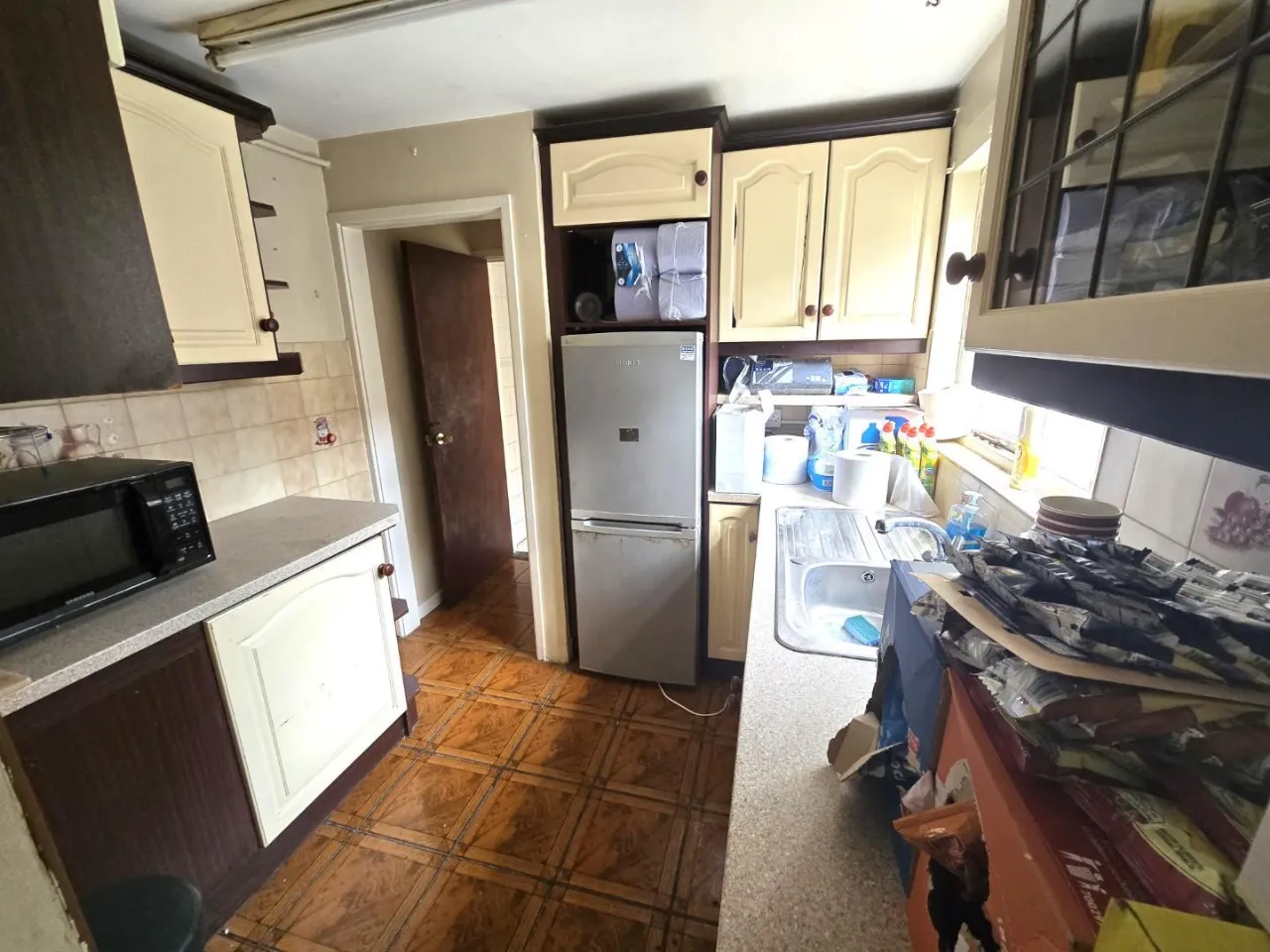 Carpet floor with part tiled, Recently re plastered, Laminate worktop, Aluminum sink, Fridge.