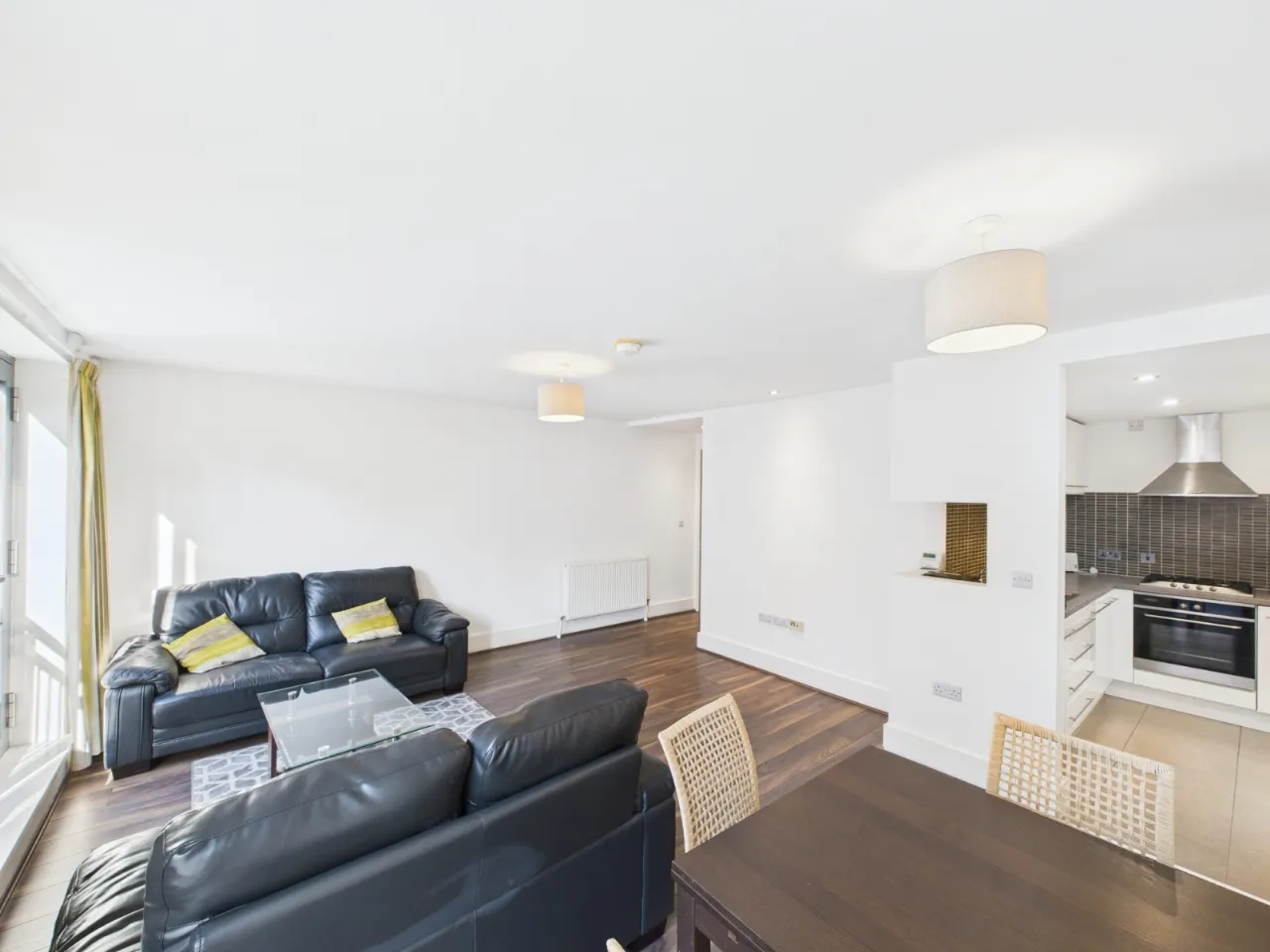 The apartment features a bright open-plan living and kitchen area, providing comfortable living space ideal for city living. The fully equipped kitchen is finished to a modern standard and includes appliances such as a dishwasher and fridge/freezer. The living area offers ample space for seating and entertainment.