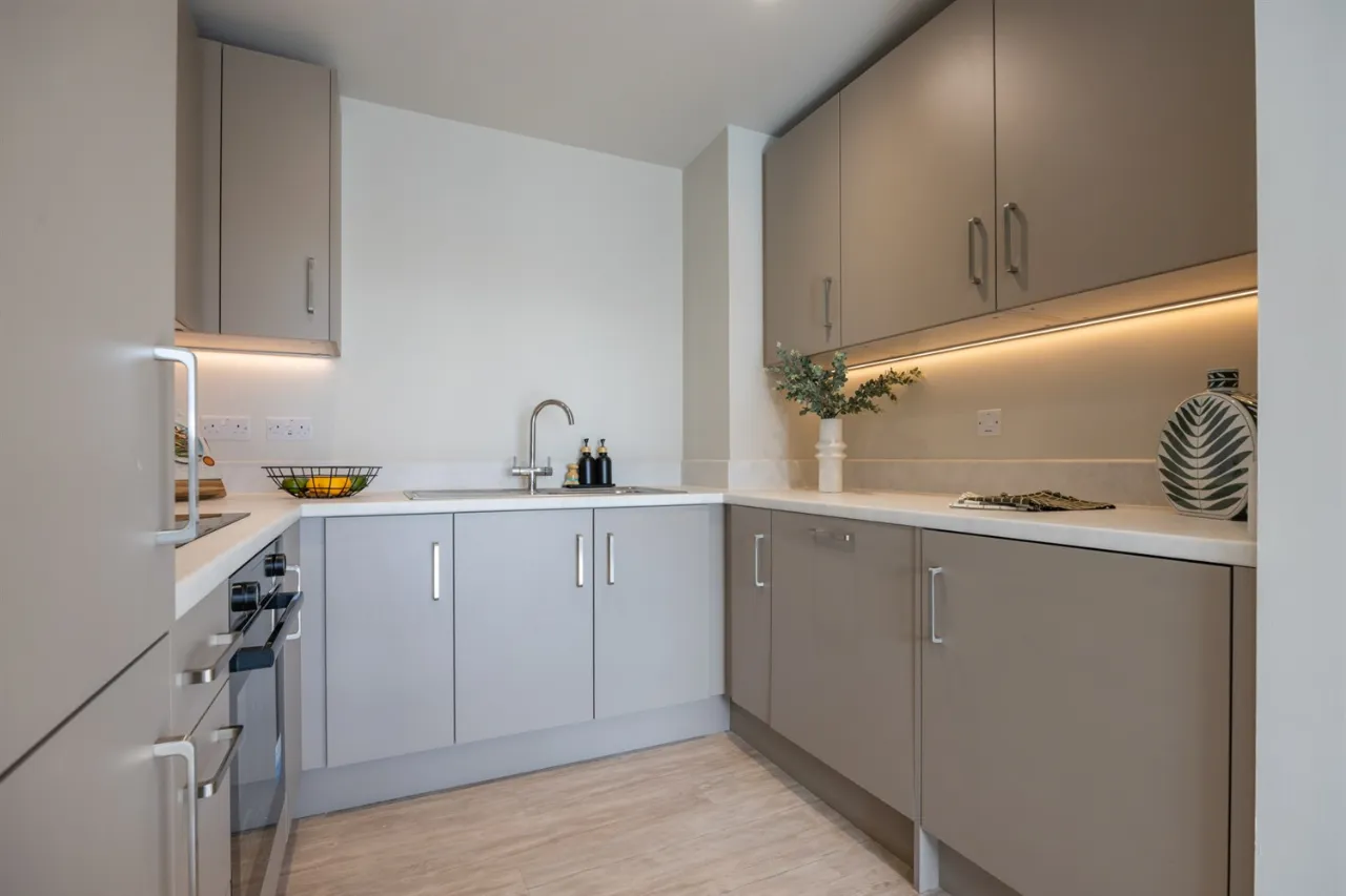 Each apartment has been thoughtfully designed to a high specification, featuring bright open-plan living areas that flow seamlessly into stylish matt grey kitchens complete with integrated appliances including a fridge freezer, dishwasher, washing machine, oven, and ceramic hob.
