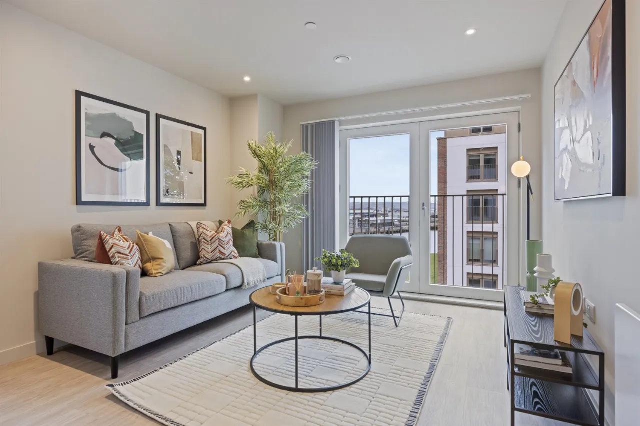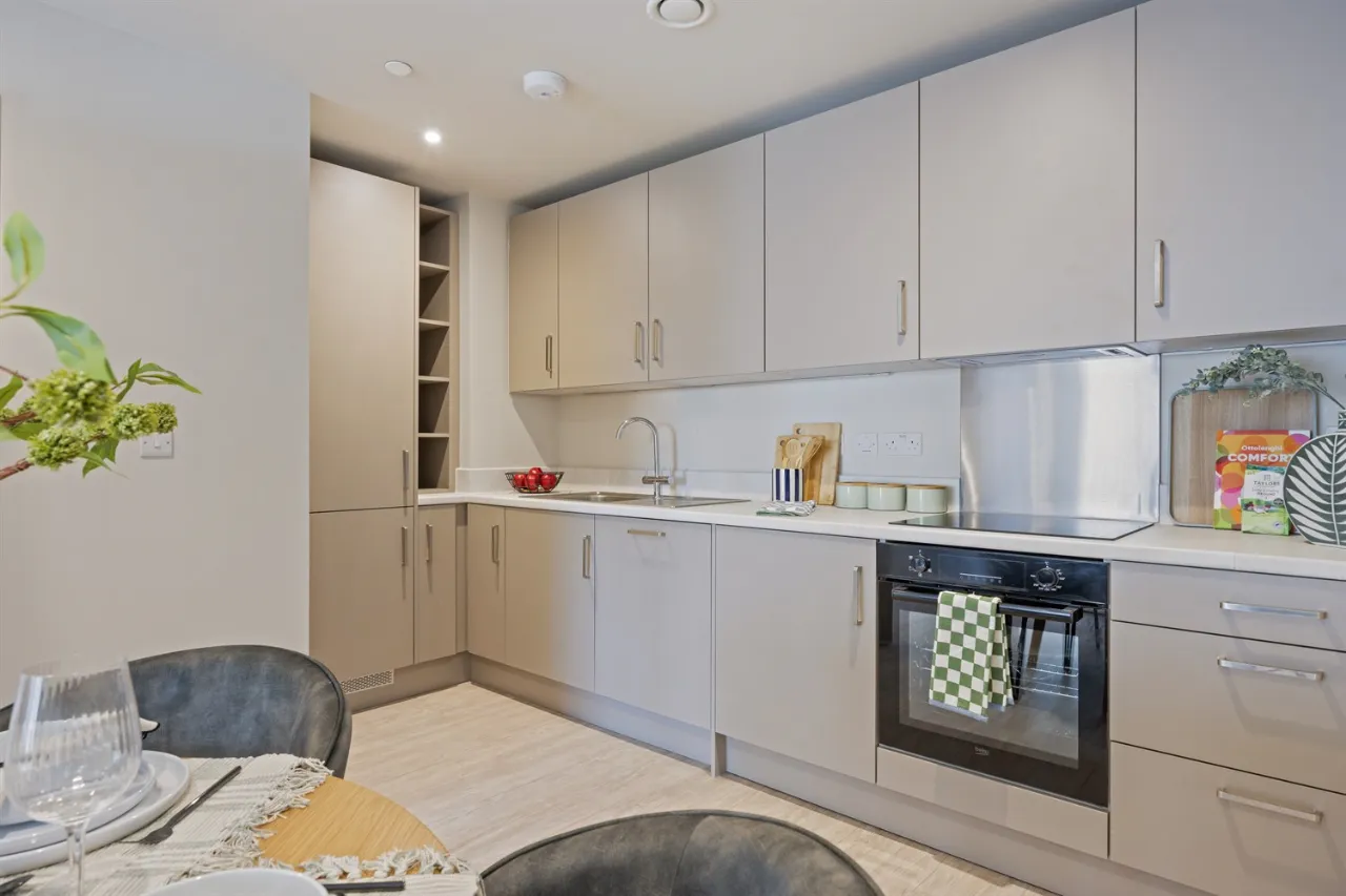 Each apartment has been thoughtfully designed to a high specification, featuring bright open-plan living areas that flow seamlessly into stylish matt grey kitchens complete with integrated appliances including a fridge freezer, dishwasher, washing machine, oven, and ceramic hob.