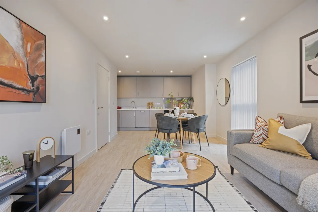 Each apartment has been thoughtfully designed to a high specification, featuring bright open-plan living areas that flow seamlessly into stylish matt grey kitchens complete with integrated appliances including a fridge freezer, dishwasher, washing machine, oven, and ceramic hob.