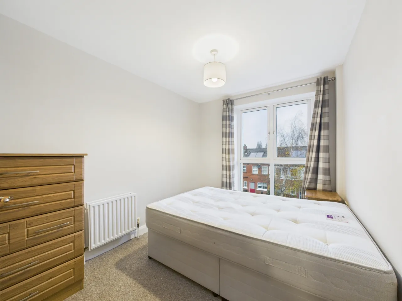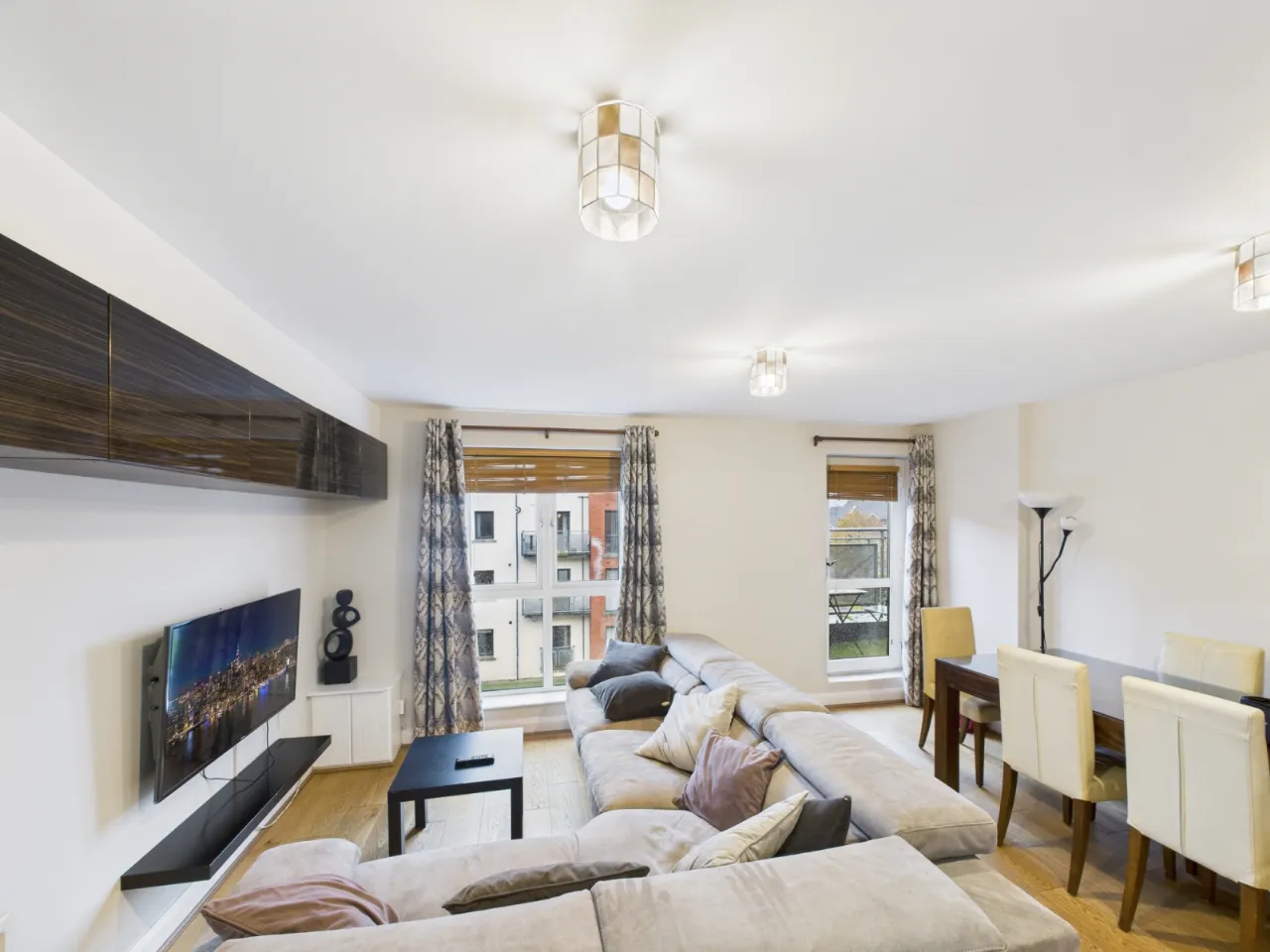 The apartment features three generously sized bedrooms, all furnished and filled with natural light. There are two modern bathrooms, including a private en-suite off the master bedroom and a main bathroom with stylish fittings. The bright and comfortable living room provides the perfect space to relax or entertain, while the fully fitted kitchen comes equipped with modern appliances, ample storage, and a dining area for everyday use. large windows throughout create a welcoming and airy atmosphere.