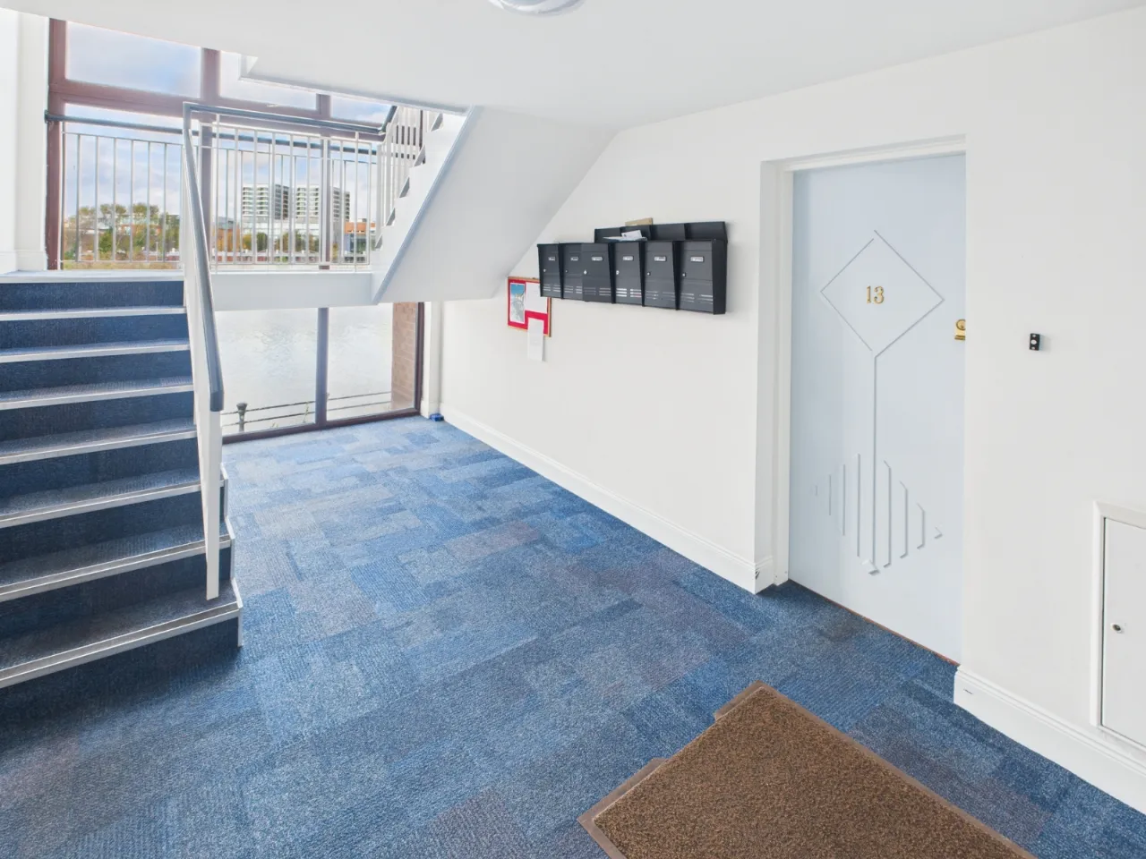 The accommodation comprises a bright and spacious lounge that opens onto a private balcony overlooking the river. A well-equipped kitchen is plumbed for both a dishwasher and washing machine. There are two bedrooms and a bathroom with a modern white suite. The property also benefits from allocated parking.