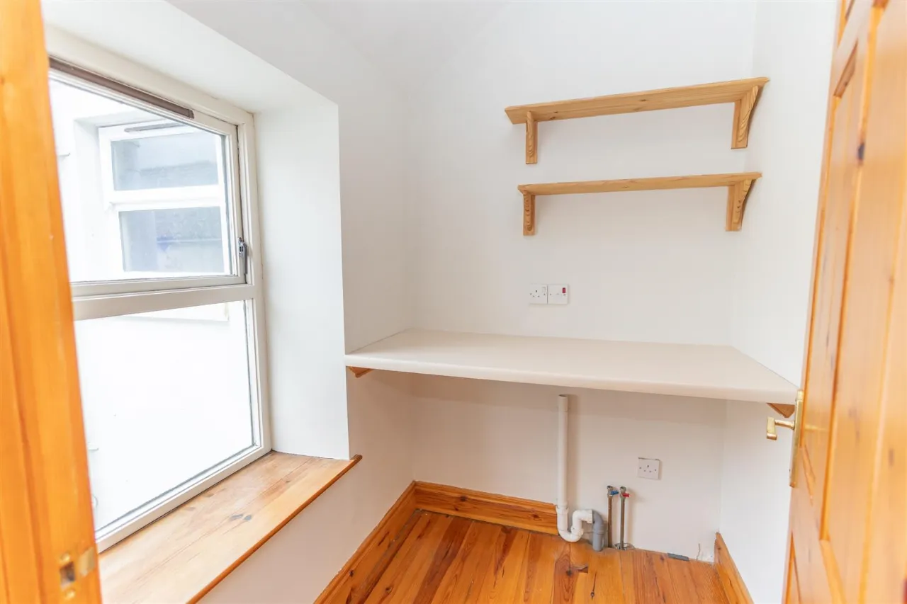 Wooden flooring. Plumbed for laundry. Work top & shelving.
