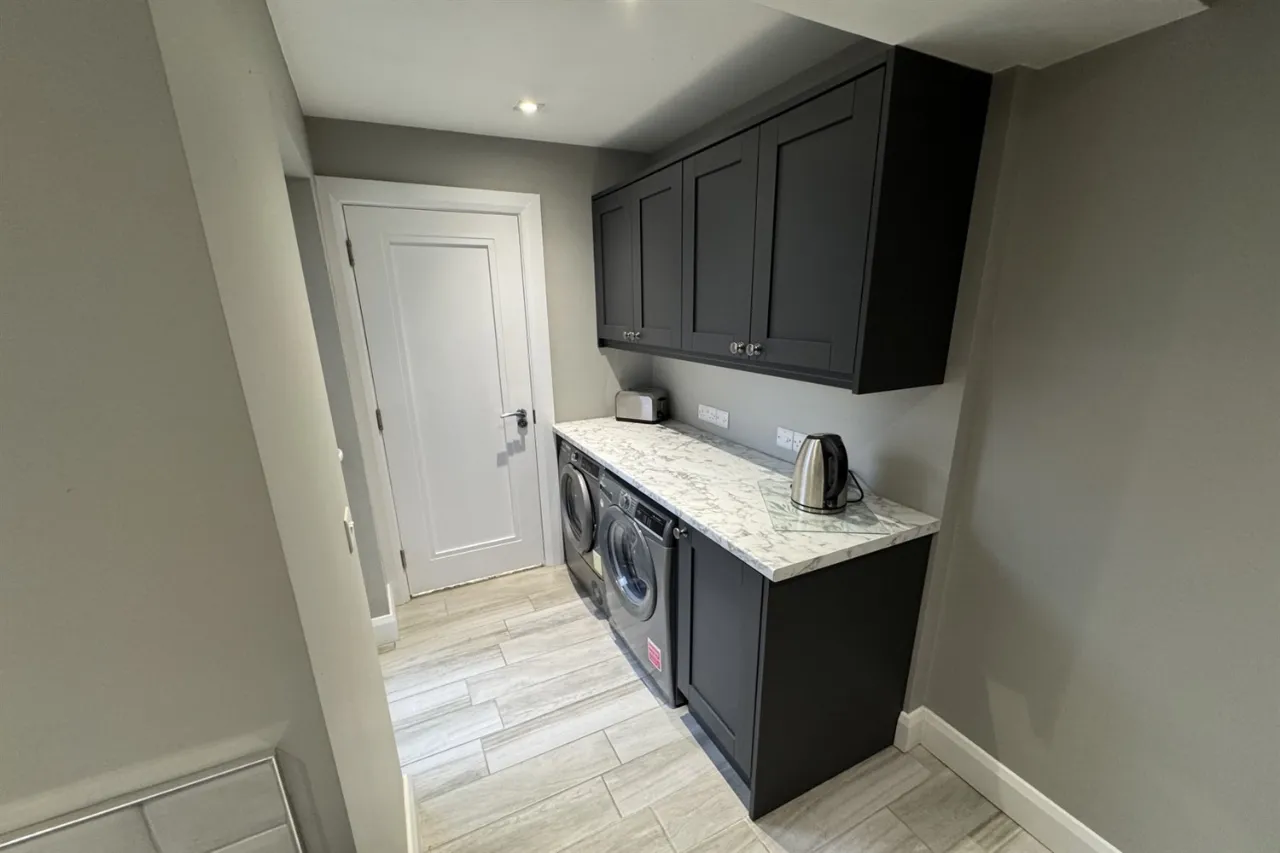 The kitchen features built in modern conveniences including Fridge Freezer, oven and cooktop with attractive subway tile back splash, Farmhouse style sink and a utility area with seperate, high spec washing machine and dryer.